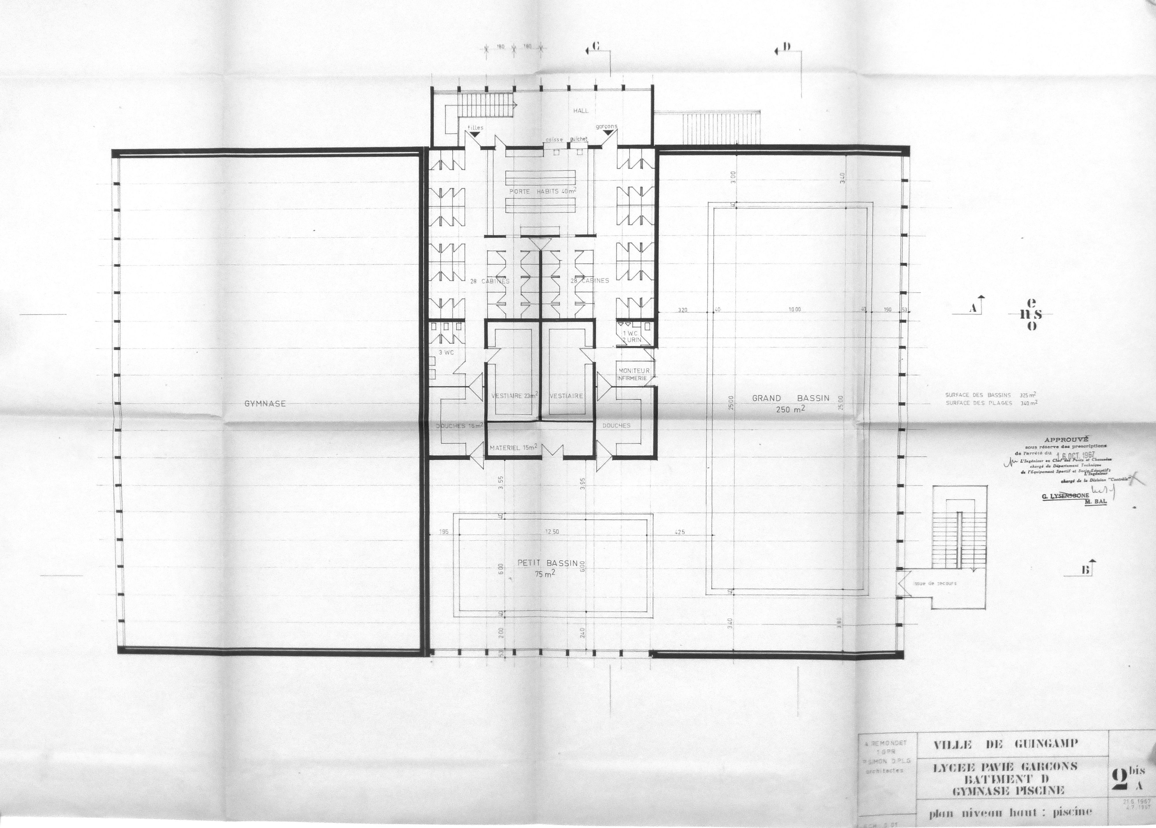 AN : 19790547/37. Plan du gymnase-piscine (niveau haut). A. Remondet, 1967.