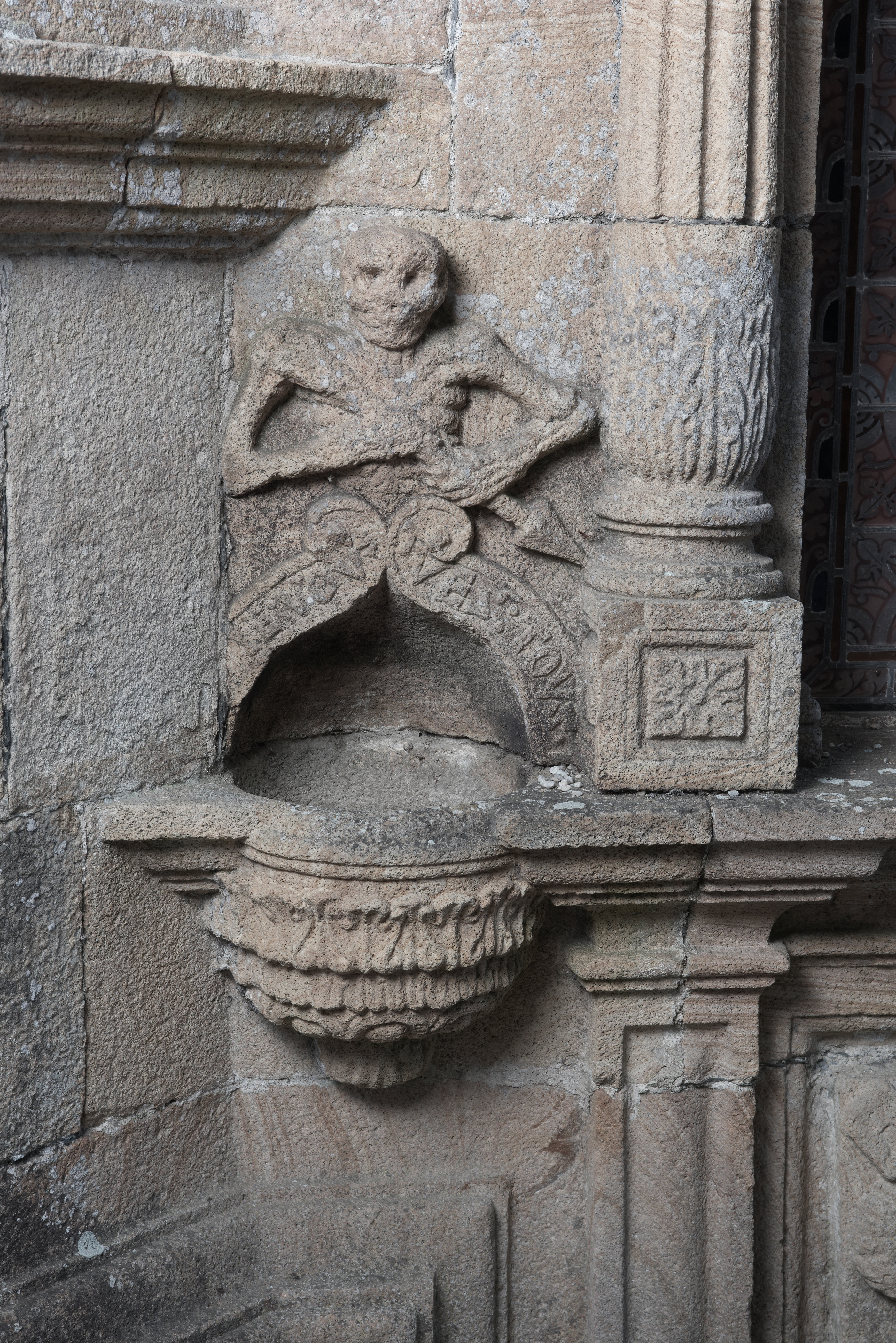 Vue de l'Ankou sur le bénitier de l'ossuaireImmatriculation