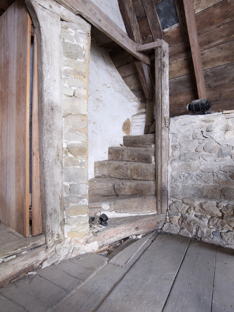 Tour d'escalier. Vue intérieure prise en haut de la tour. Détail de l'escalier en vis secondaire menant à la pièce haute disparueImmatriculation