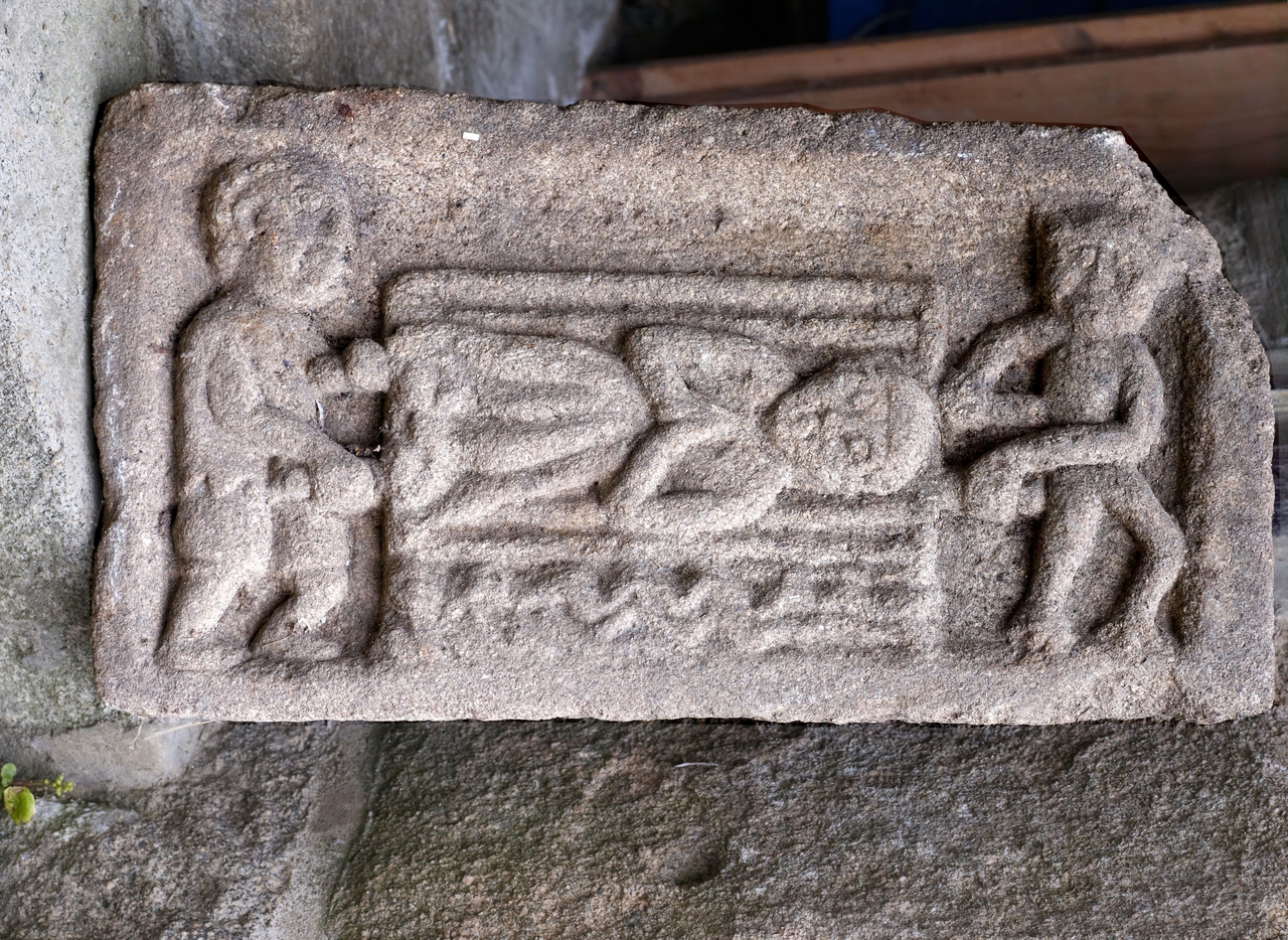 Pierre sculptée retrouvée dans le jardin. Saint-Laurent sur son grillImmatriculation