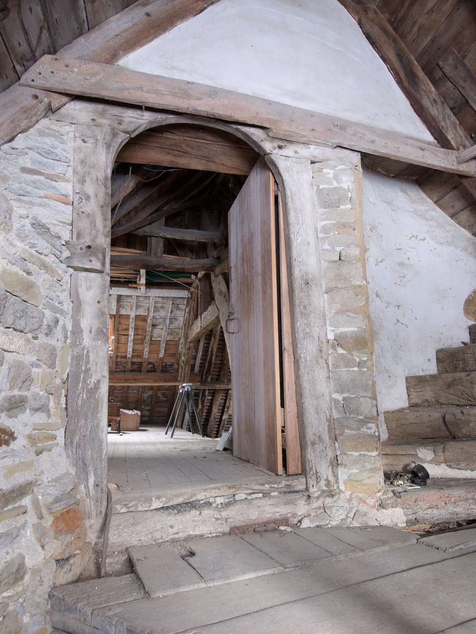 Tour d'escalier. Vue intérieure prise en haut de la tour. Détail de la porte palière ouvrant sur les comblesImmatriculation