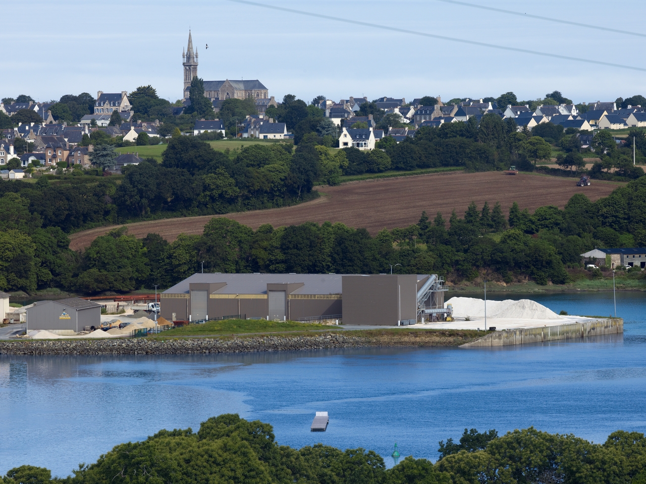 Tréguier : port de commerce, quai sud et hangar à minéraux. En arrière plan, le bourg de PlouguielImmatriculation