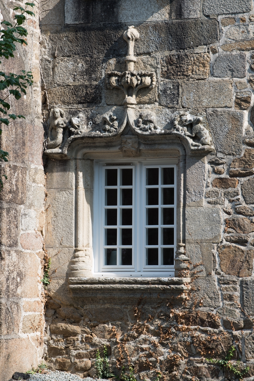 Communs, façade sud, détail, fenêtre sculptée d'une accolade, décor de feuilles, de part et d'autre une sirène et un lapinImmatriculation