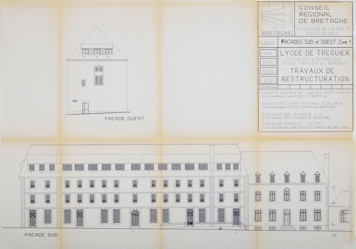 Tréguier : travaux de restructuration du lycée, zone 1, élévation sud et ouest, 15 mars 1990 (Architectes SCPA : M. Rohner et P. Delvaux)Immatriculation