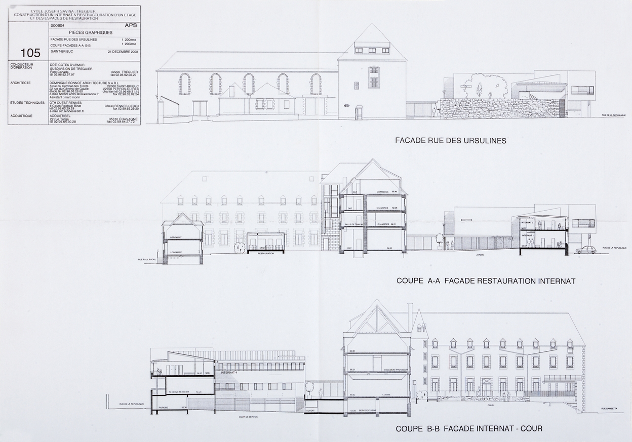 Tréguier : lycée Joseph Savina, construction d'un internat et restructuration d'un étage et des espaces de restauration, élévations (rue des Ursulines, restauration internat, internat - cour), non daté (Architecte : Dominique Bonnot, Saint-Brieuc)Immatriculation