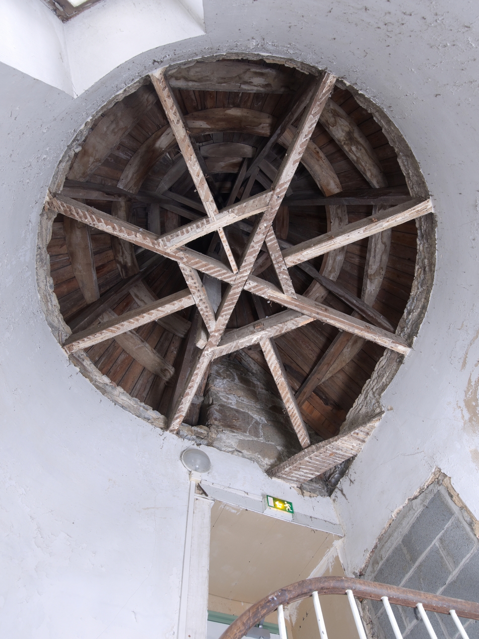 Tour d'escalier assurant la jonction entre le grand corps de logis et les bâtiments construits dans la basse-cour. Charpente du toitImmatriculation