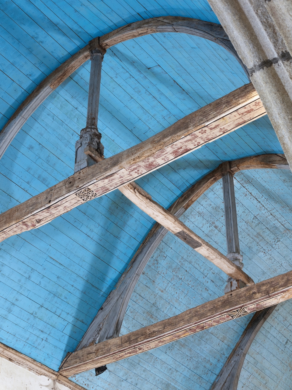 Charpente de la nef, vue biaise sur les fermes au dessus du choeurImmatriculation