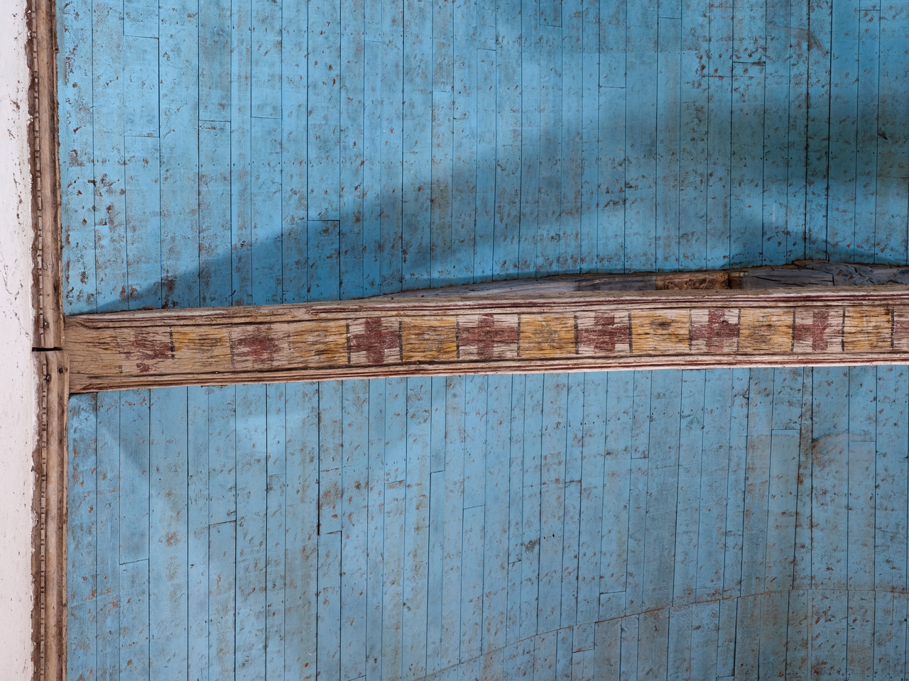 Charpente de la nef ; entrait à décor de fleurs noires et de croix rougesImmatriculation