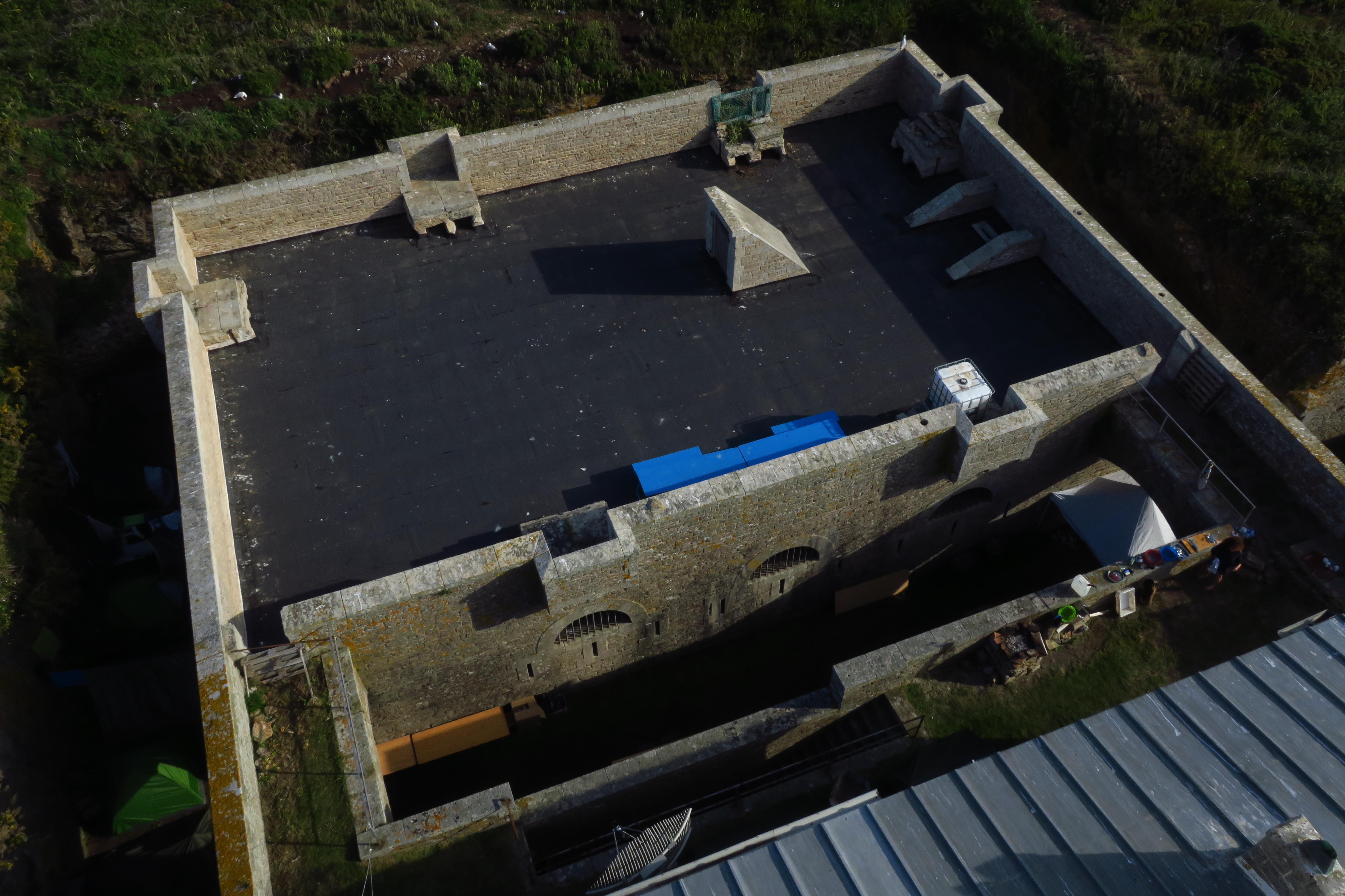 Archipel de Glénan, batterie de Penfret, corps de garde crénelé, vue de la terrasse depuis le sommet du phare en 2017.Immatriculation