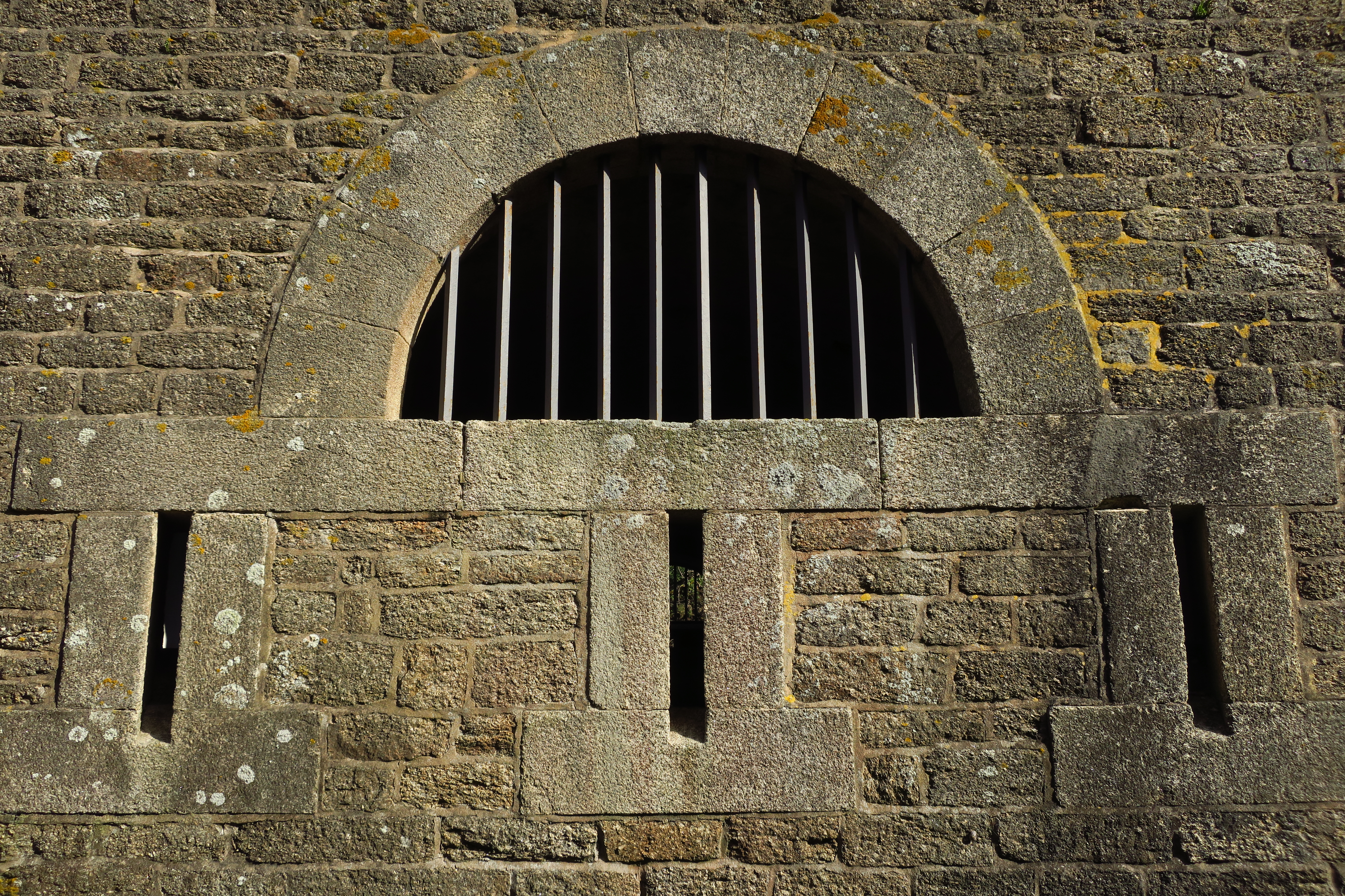 Archipel de Glénan, batterie de Penfret, corps de garde crénelé, façade sud, détail d'une baie et de créneaux de tir.Immatriculation