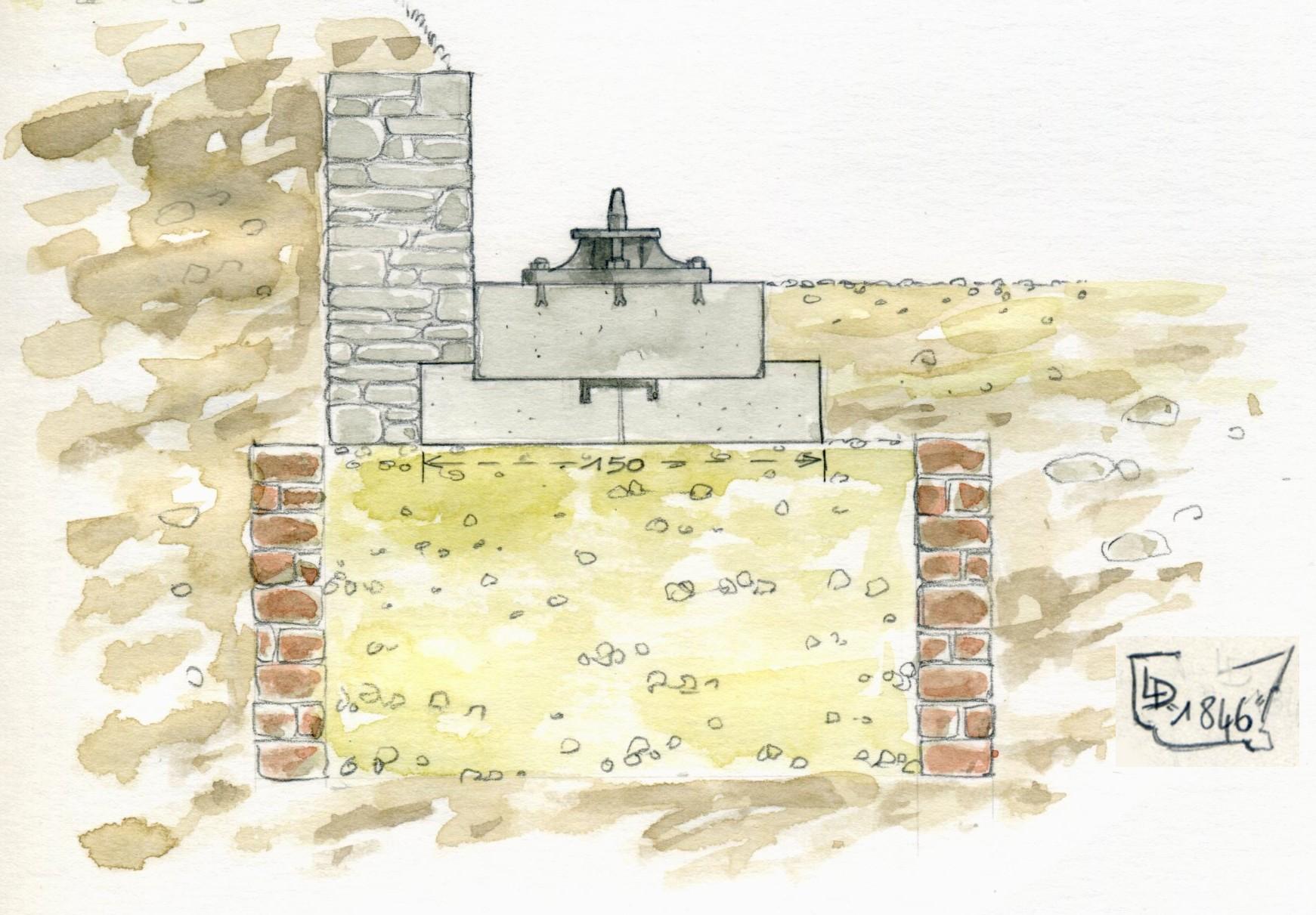 Evocation du massif d'ancrage en maçonnerie d'une plate-forme d'artillerie de côte, par Lionel Duigou.Immatriculation