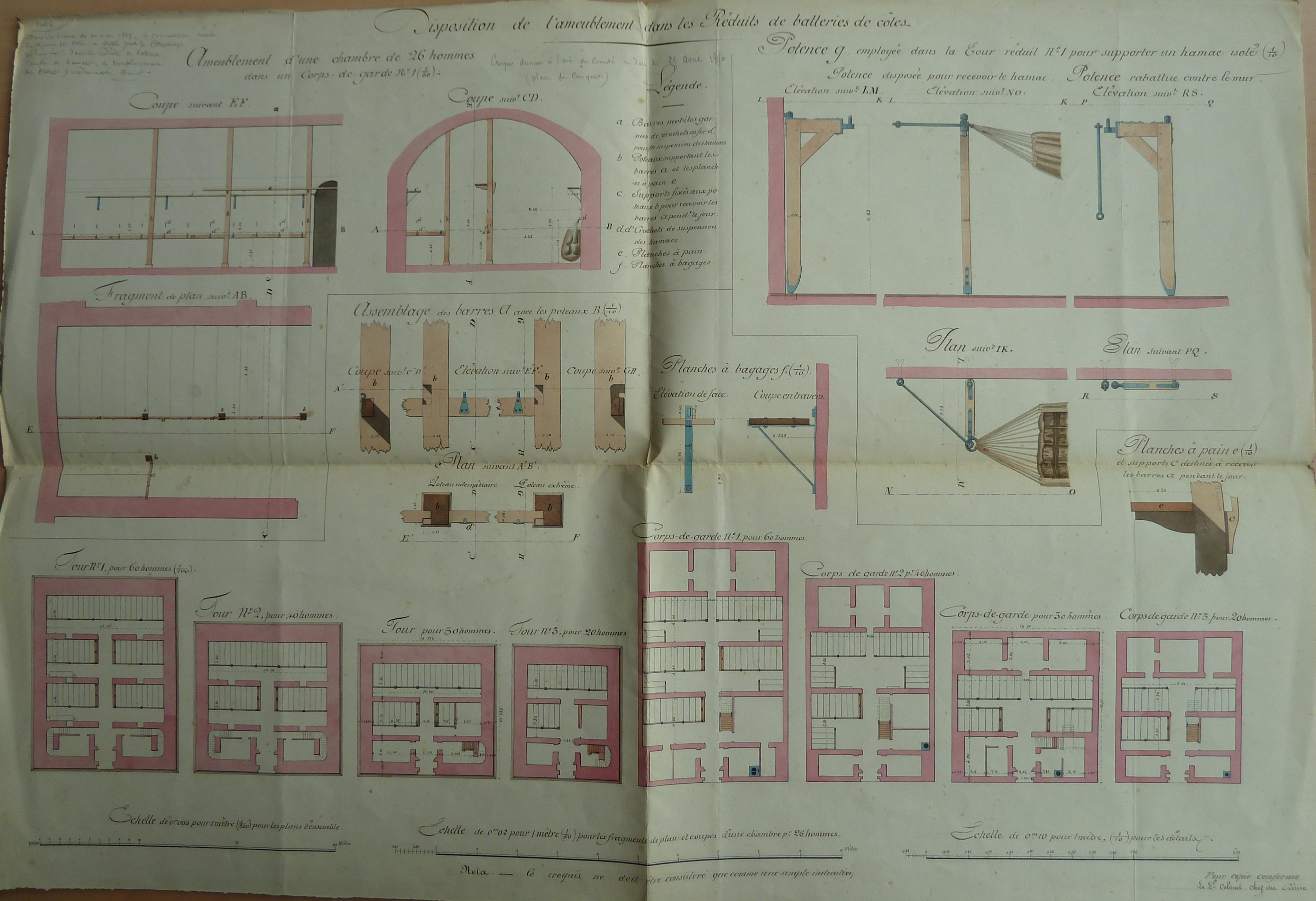 Service historique de la Défense, département Armée de Terre, Vincennes. Archives du Génie ; Article 12, Avis du Comité : 1 VK 139, Objets d'art : notes, mémoires et croquis de types (modèles) annexés aux avis du Comité du génie. Disposition de l'ameublement dans les réduits de batteries de côtes, 1850.