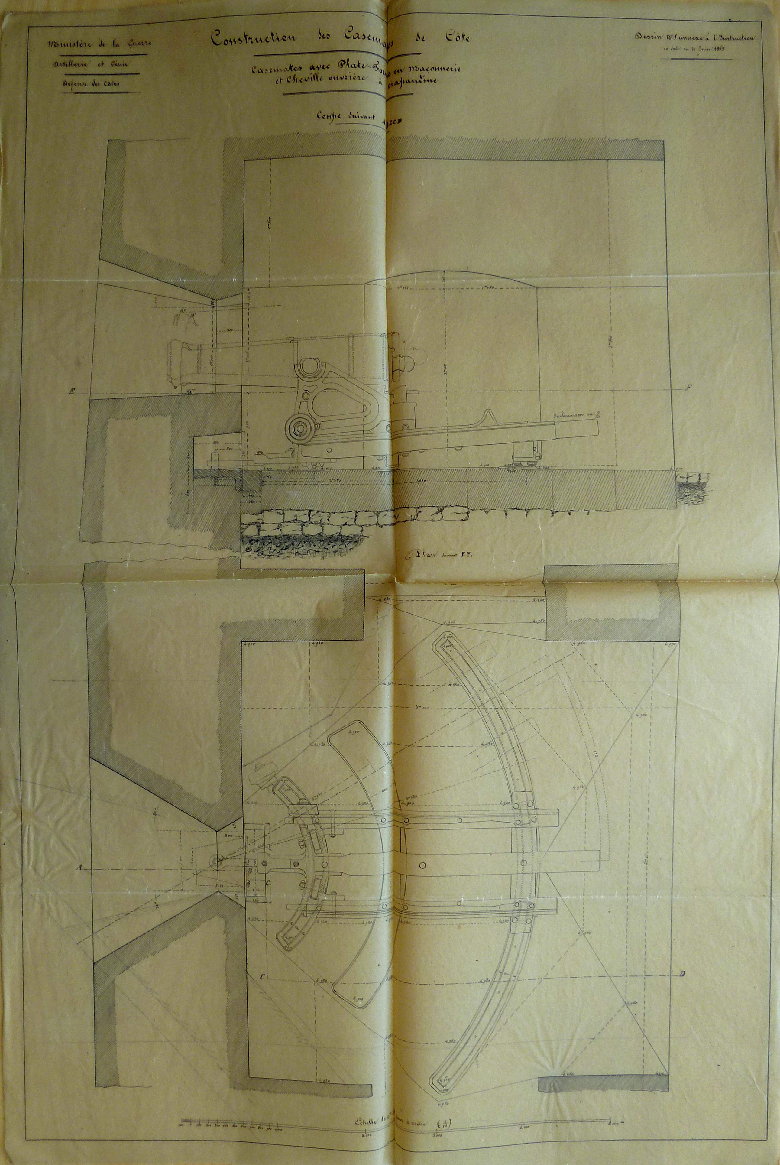 Service historique de la Défense, département Armée de Terre, Vincennes. Archives du Génie ; Article 12, Avis du Comité : 1 VK 141, Objets d'art : notes, mémoires et croquis de types (modèles) annexés aux avis du Comité du génie. Ministère de la Guerre, Artillerie et Génie, défense des côtes, construction des casemates de côte, dessin n° 1 annexé à l'instruction en date du 20 juin 1853.