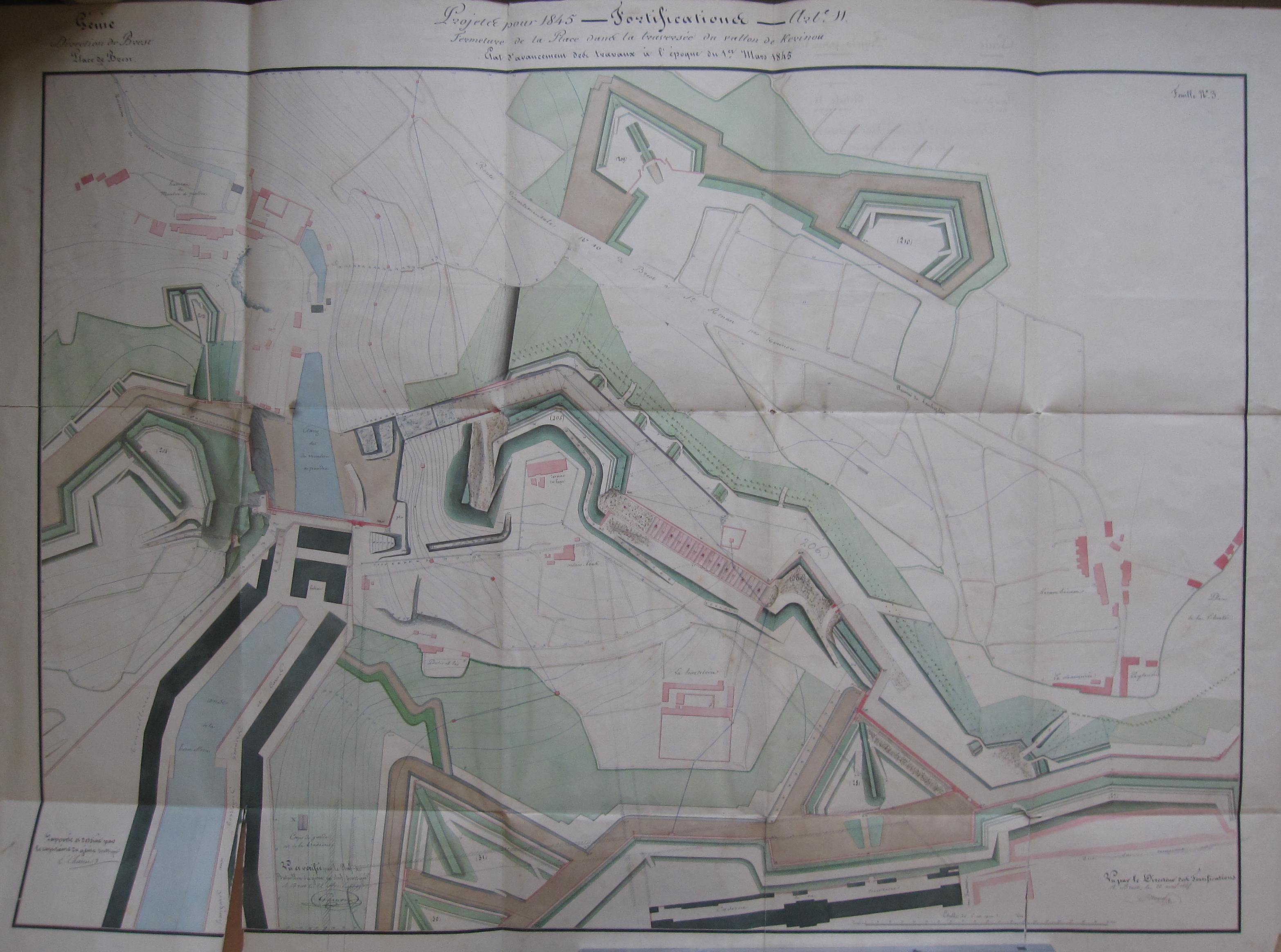 Service historique de la Défense, département Armée de Terre, Vincennes. Archives du Génie ; Article 8, Places françaises et d'Algérie : 1 VH 463, Place de Brest, projets et dépenses annuels, 1845-1848. Direction du Génie de Brest, Place de Brest, feuille n° 3 des projets pour 1845, fermeture de la place dans la traversée du vallon de Kérinou, état d'avancement des travaux à l'époque du 1er mars 1845.