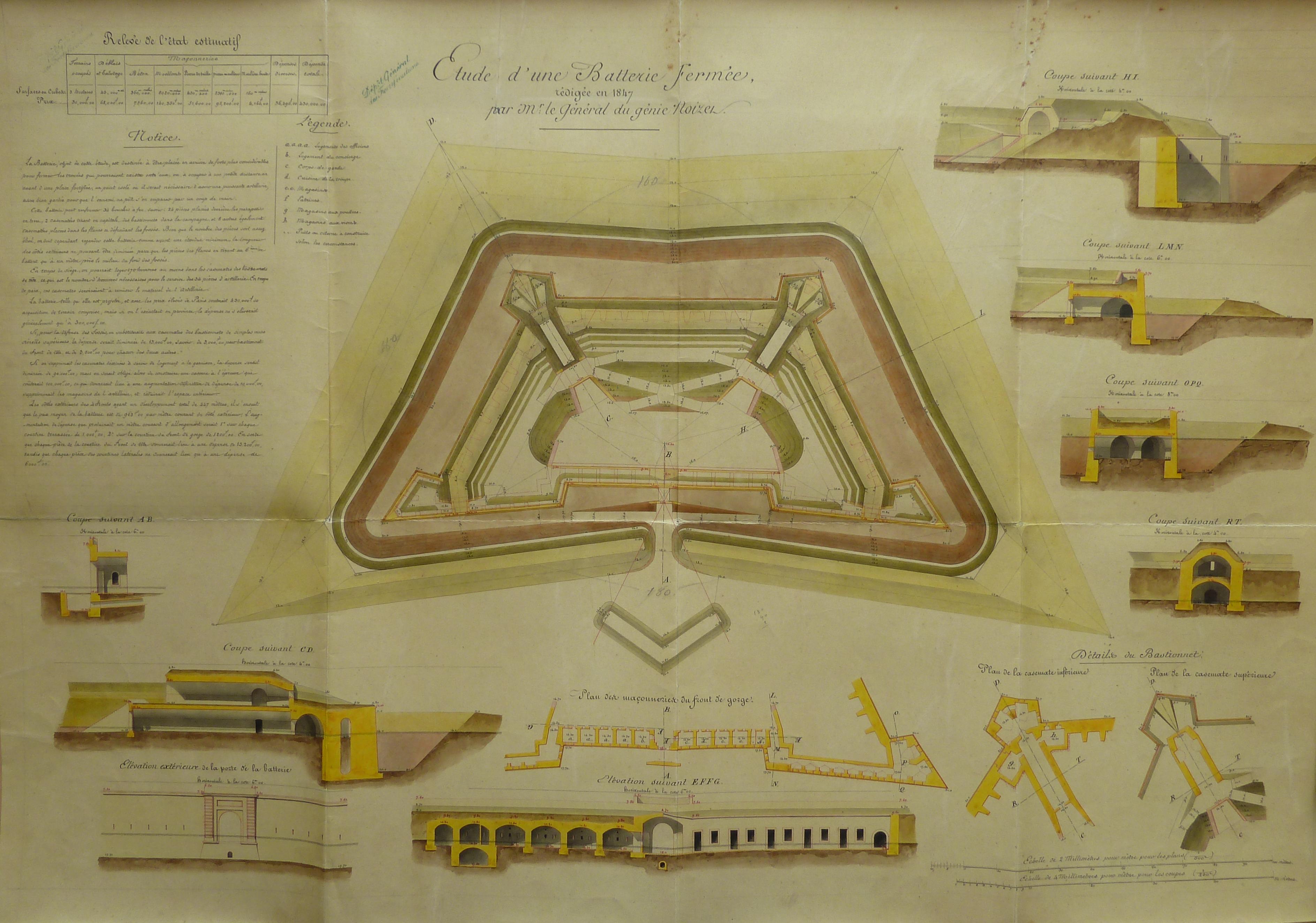 Service historique de la Défense, département Armée de Terre, Vincennes. Archives du Génie ; Article 12, Avis du Comité : 1 VK 141, Objets d'art : notes, mémoires et croquis de types (modèles) annexés aux avis du Comité du génie. Étude d'une batterie fermée rédigée en 1847 par Mr le général du génie Noizet.
