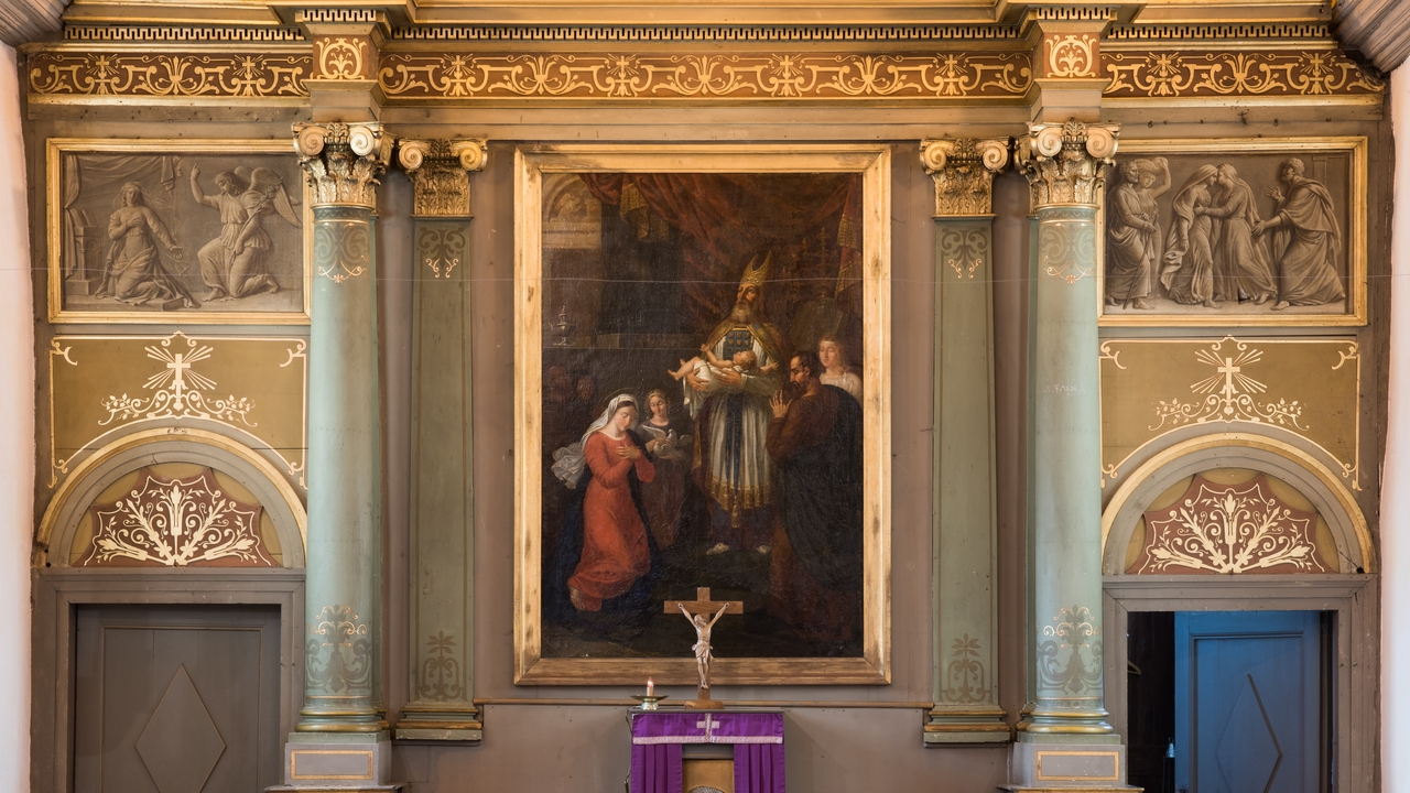 Tableau d'Antoine Logerot "La présentation de Jésus au temple", 1828 inscrit entre deux toiles néo-classiques en trompe l’œil représentant la Visitation et l'AnnonciationImmatriculation