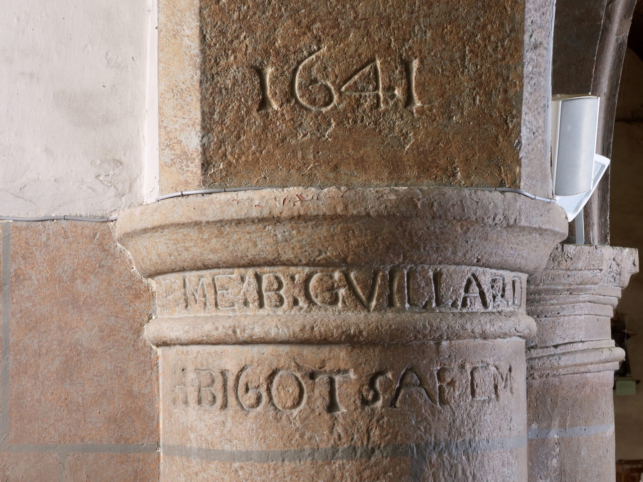 Pilier de l'arc surbaissé entre le choeur et la chapelle sud : inscriptionImmatriculation