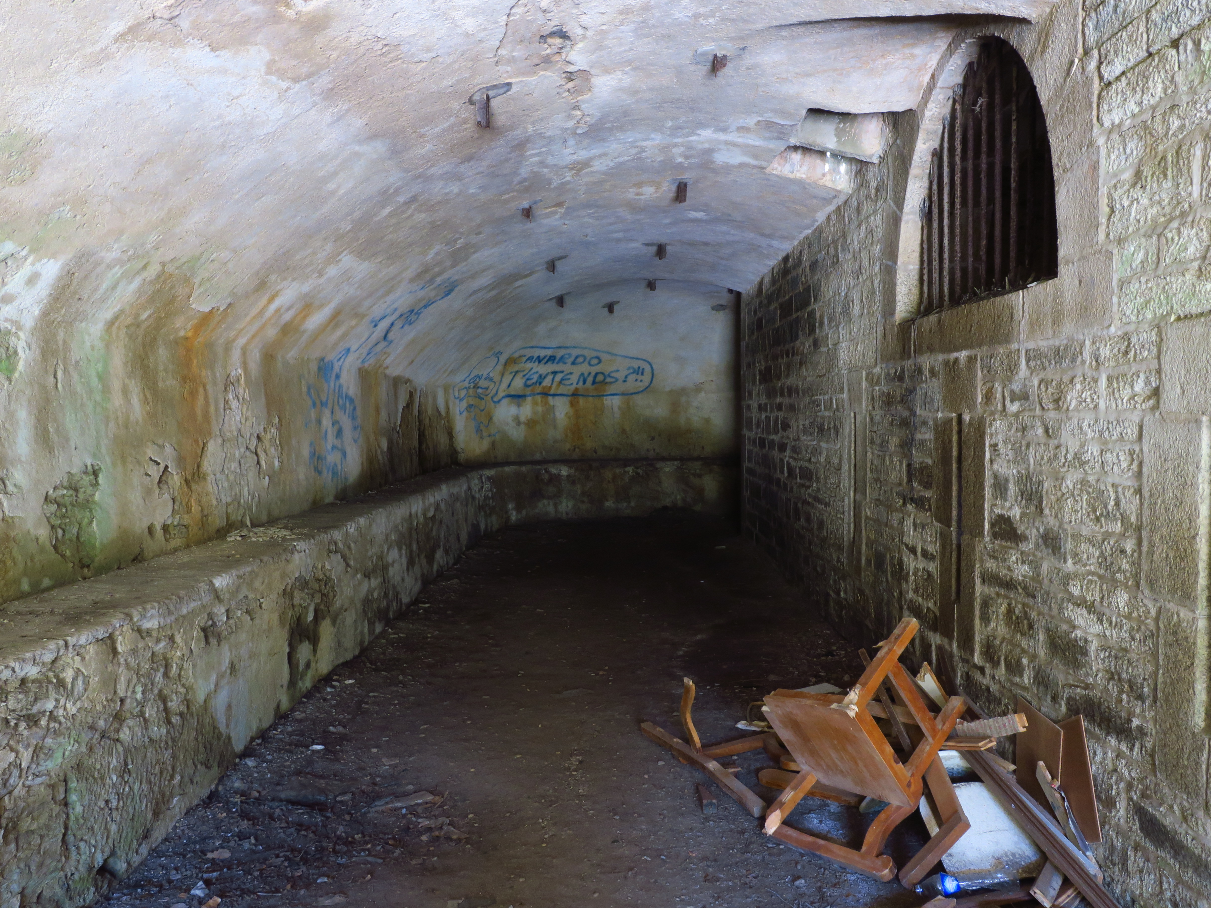 Groix, batterie du Bas-Grognon, corps de garde crénelé, couloir voûté latéral.Immatriculation