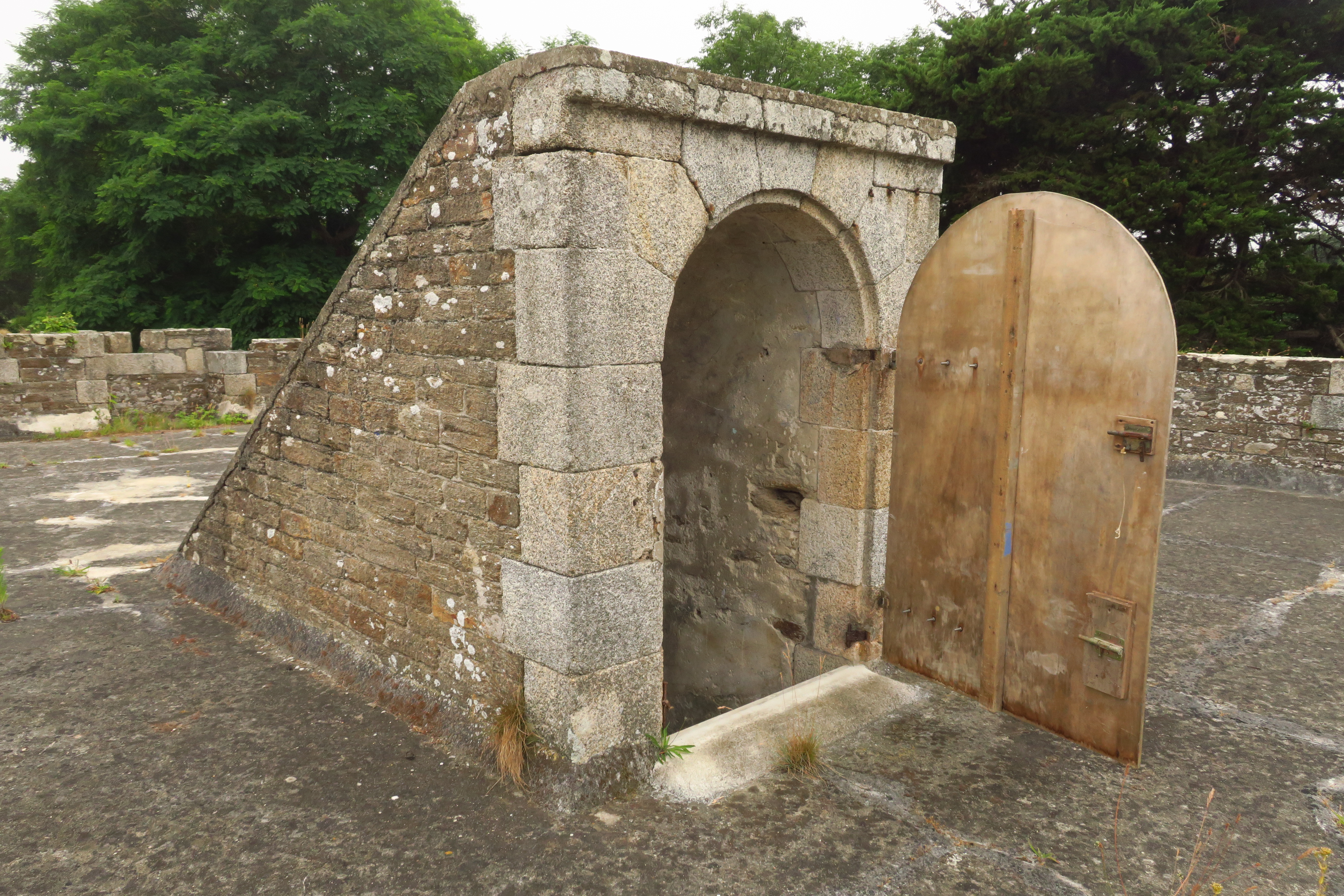 Groix, batterie du Gripp, corps de garde crénelé, débouché de l'escalier sur la terrasse.Immatriculation