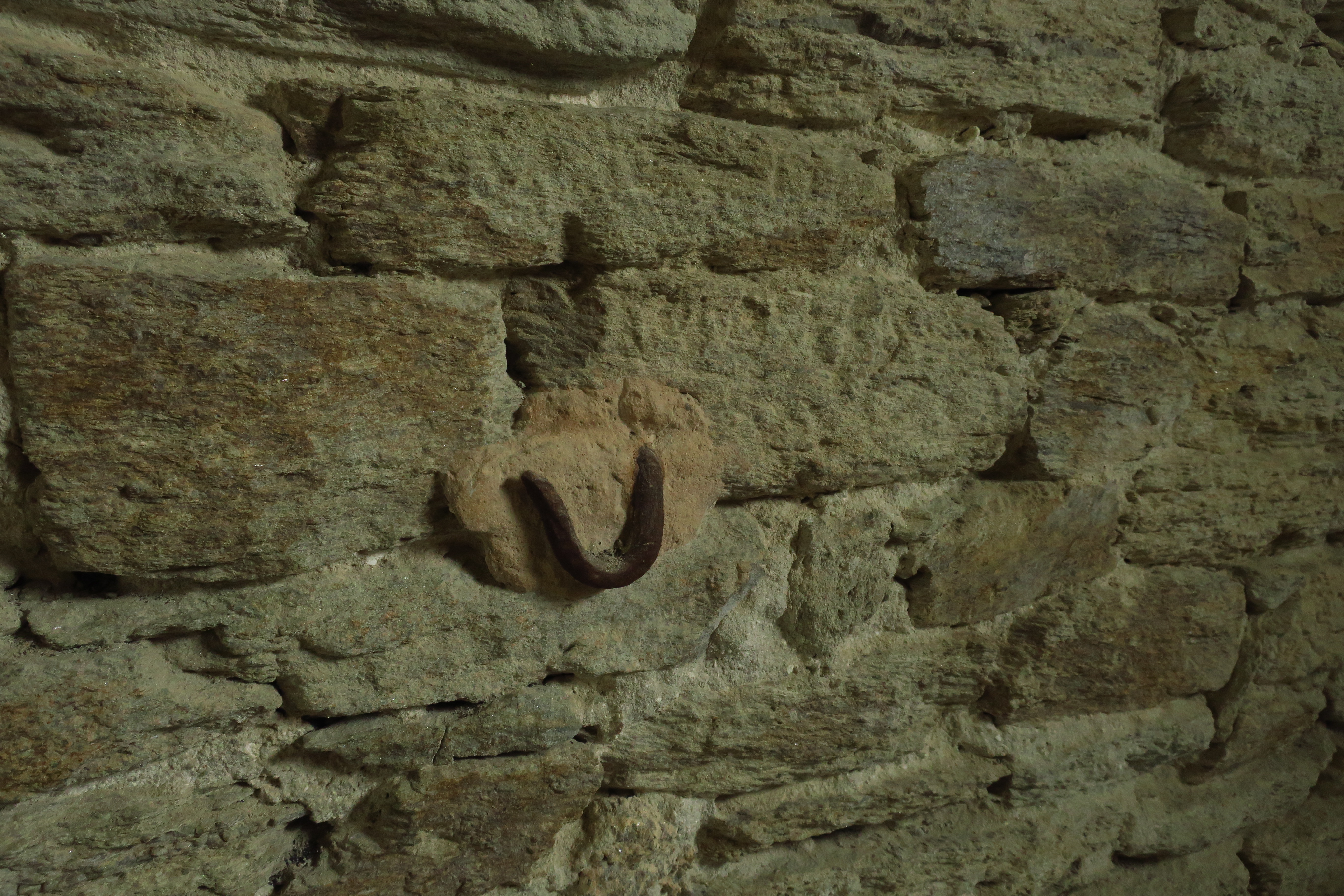 Groix, batterie du Gripp, corps de garde crénelé, crochet de hamac dans une chambrée.Immatriculation
