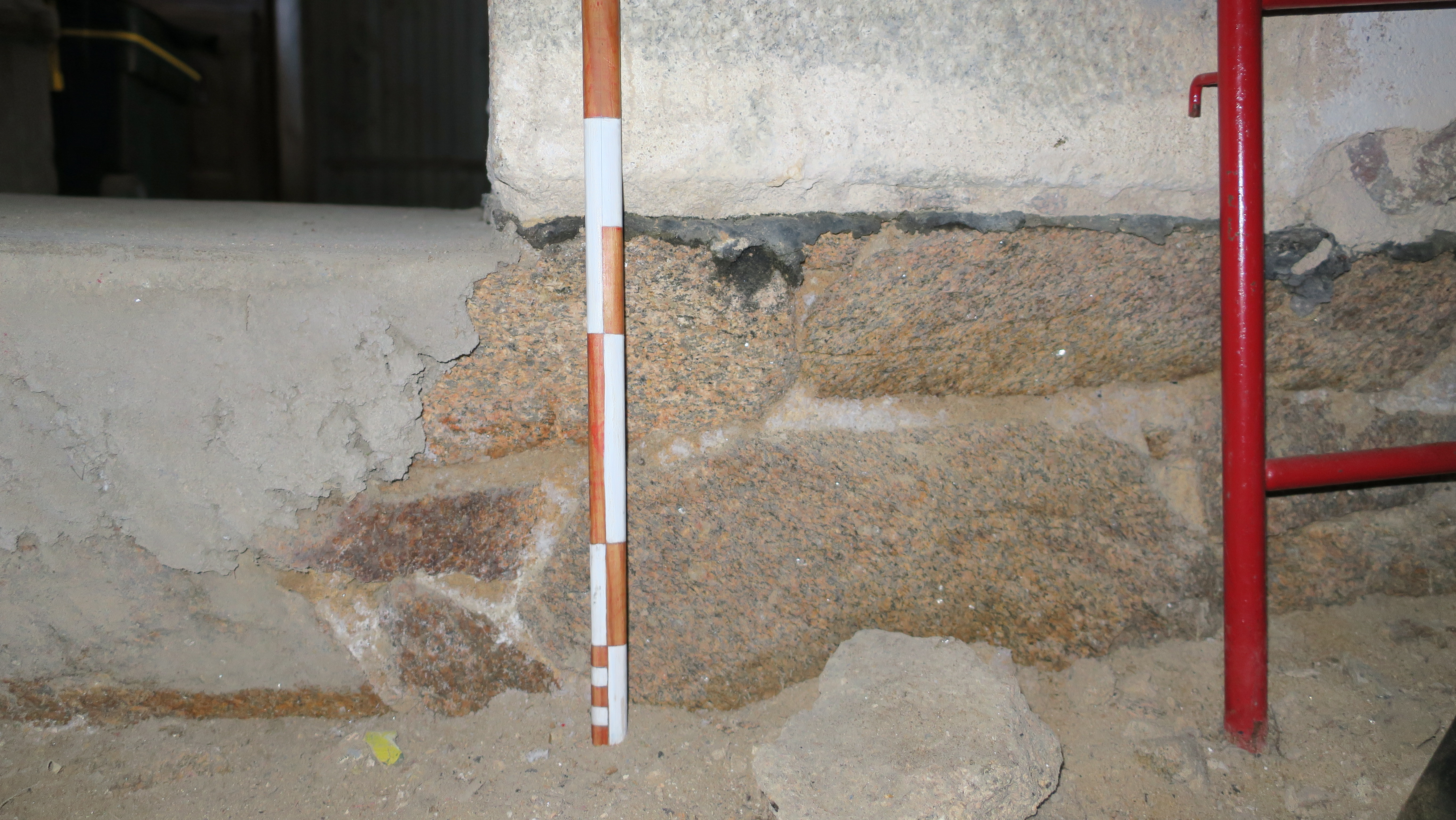 Île-d'Houat, batterie du Béniguet, corps de garde crénelé, couche d'enduit bitumineux visible dans le vide sanitaire d'un des magasins à poudre.Immatriculation