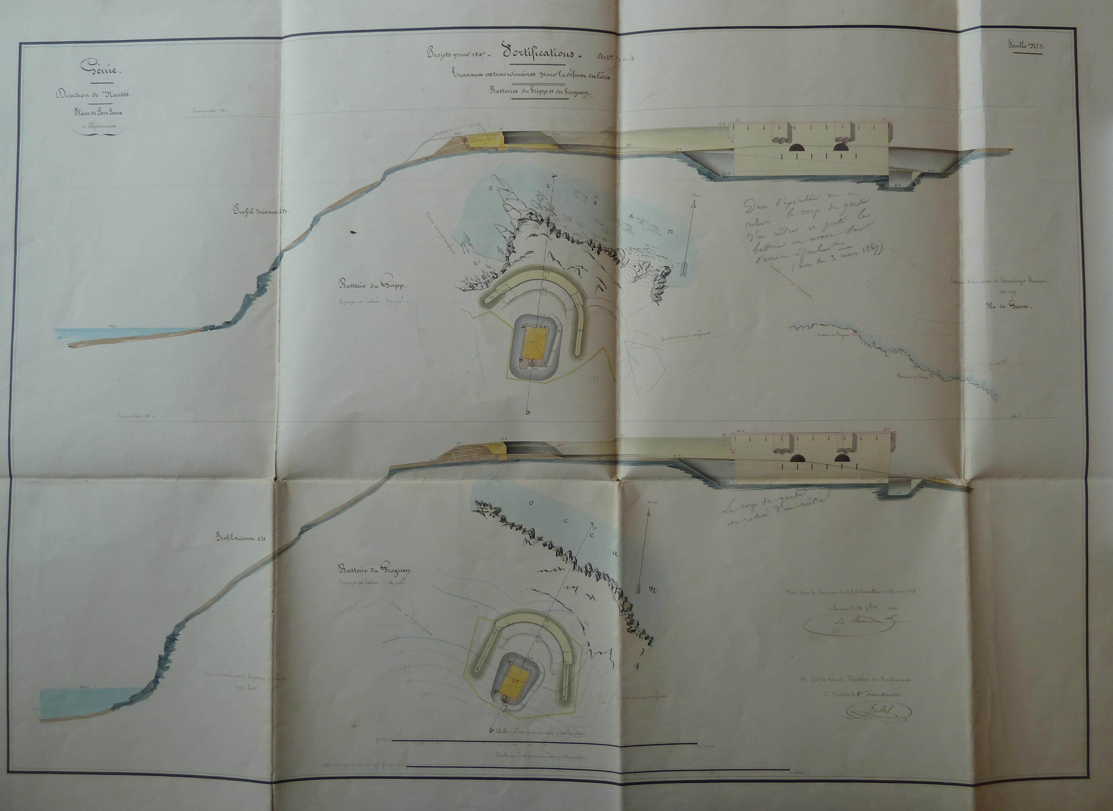 Service historique de la Défense, département Armée de Terre, Vincennes. Archives du Génie ; Article 8, Places françaises et d'Algérie : 1 VH 1474, Place de Port-Louis, projets et dépenses annuels, 1847-1856. Direction du Génie de Nantes, Place de Port-Louis, feuille n° 8 des projets pour 1848, travaux extraordinaires pour la défense des côtes, batteries du Gripp et du Grognon, 22 novembre 1846.