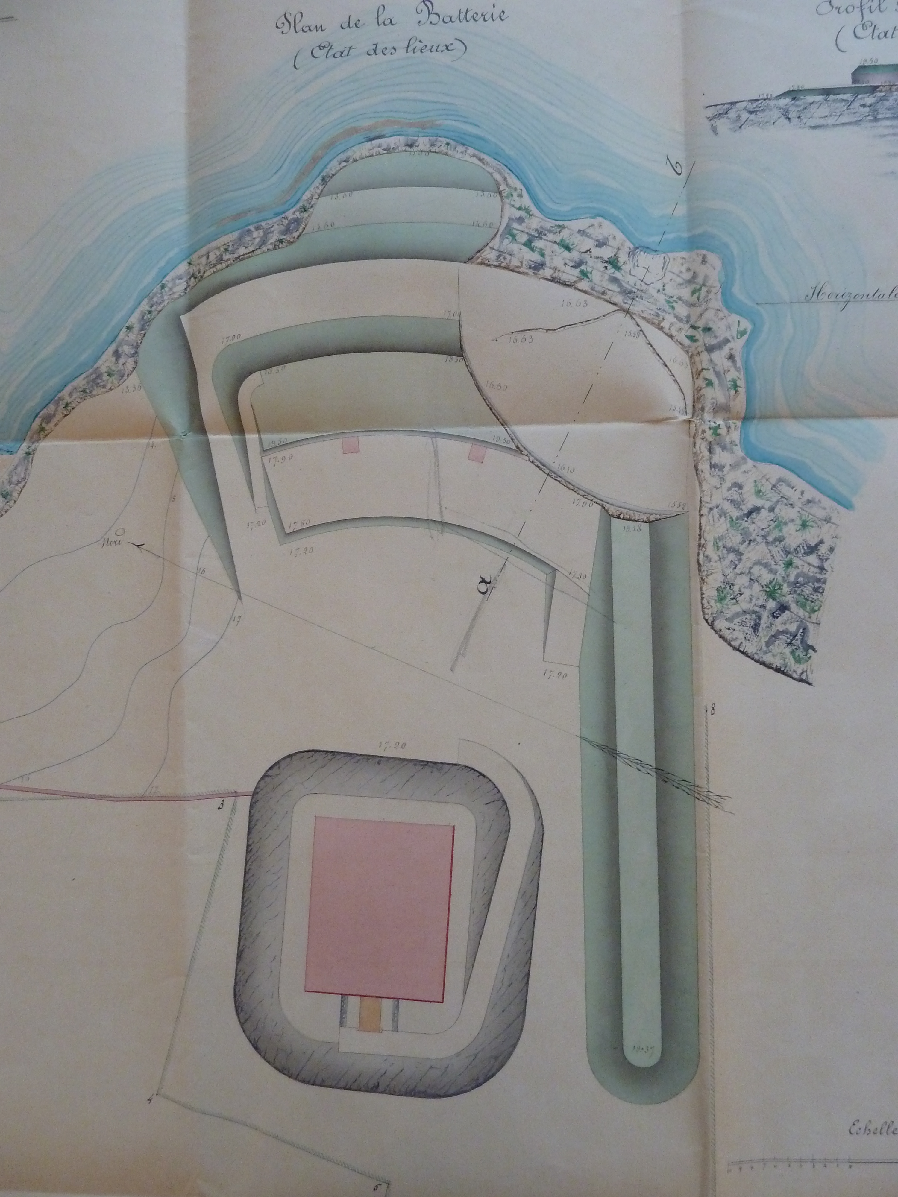 1 VH 1475. Place de Port-Louis, feuille n° 3 des projets supplémentaires pour 1869-1870, reculer la batterie de Nosterven, 30 novembre 1869.Immatriculation