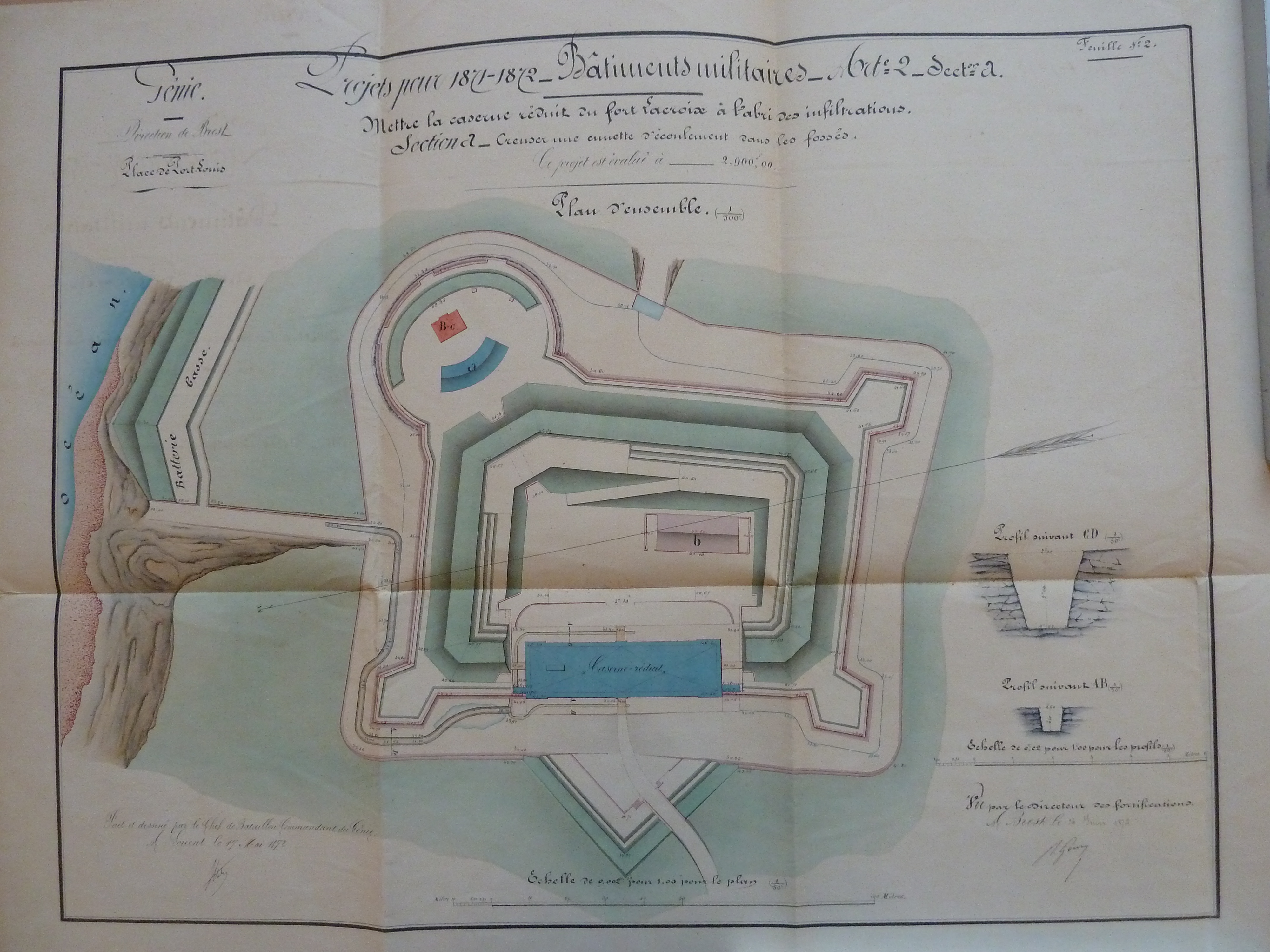 Service historique de la Défense, département Armée de Terre, Vincennes. Archives du Génie ; Article 8, Places françaises et d'Algérie : 1 VH 1475, Place de Port-Louis, projets et dépenses annuels, 1857-1875. Direction du Génie de Brest, Place de Port-Louis, feuille n° 2 des projets pour 1871-1872, mettre la caserne-réduit du fort Lacroix à l'abri des infiltrations, 17 mai 1872.