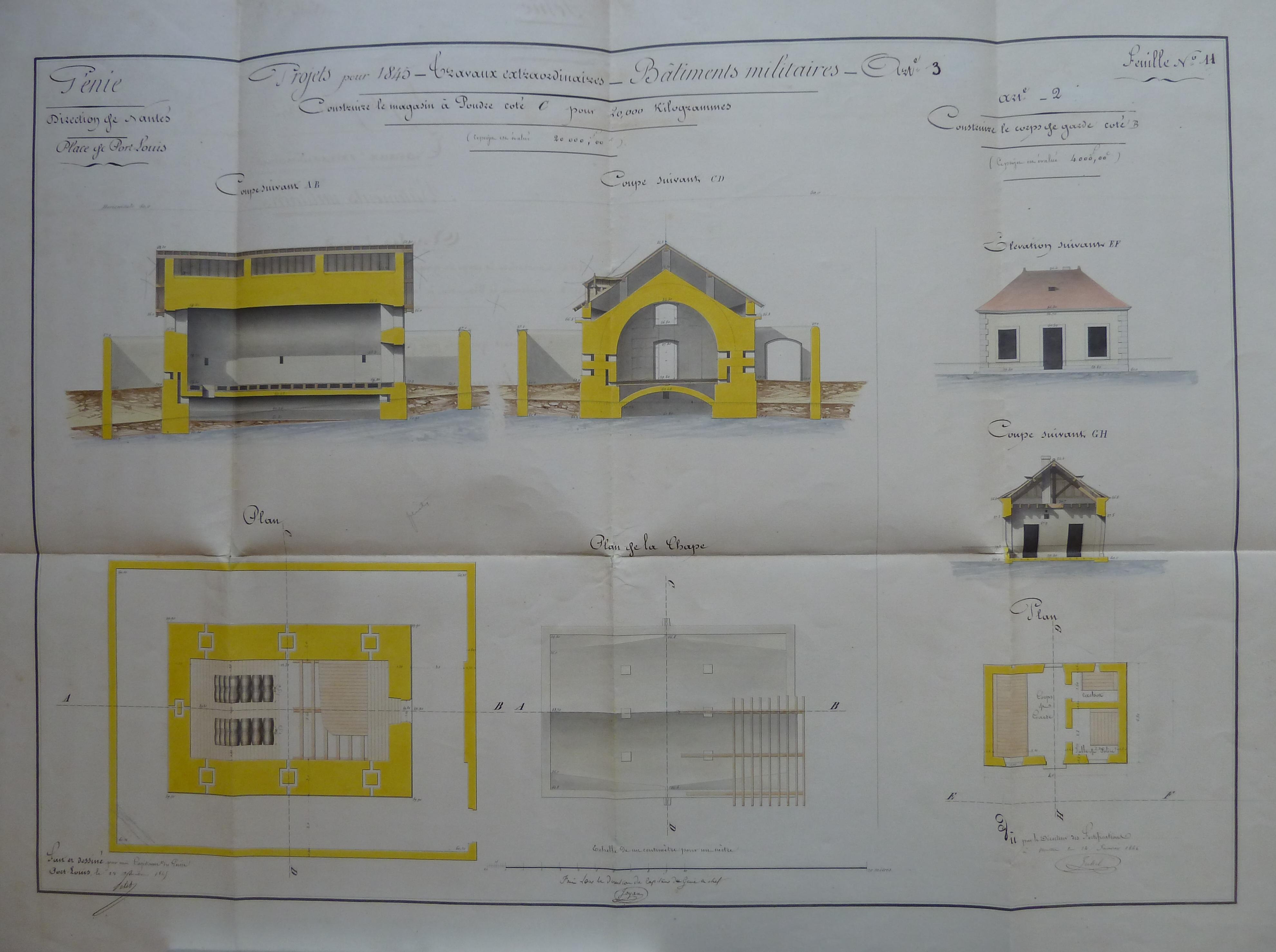 Service historique de la Défense, département Armée de Terre, Vincennes. Archives du Génie ; Article 8, Places françaises et d'Algérie : 1 VH 1473, Place de Port-Louis, projets et dépenses annuels, 1835-1846. Direction du Génie de Nantes, Place de Port-Louis, feuille n° 11 des projets extraordinaires pour 1845, construire le magasin à poudre coté C pour 20000 kilogrammes, 28 décembre 1845.