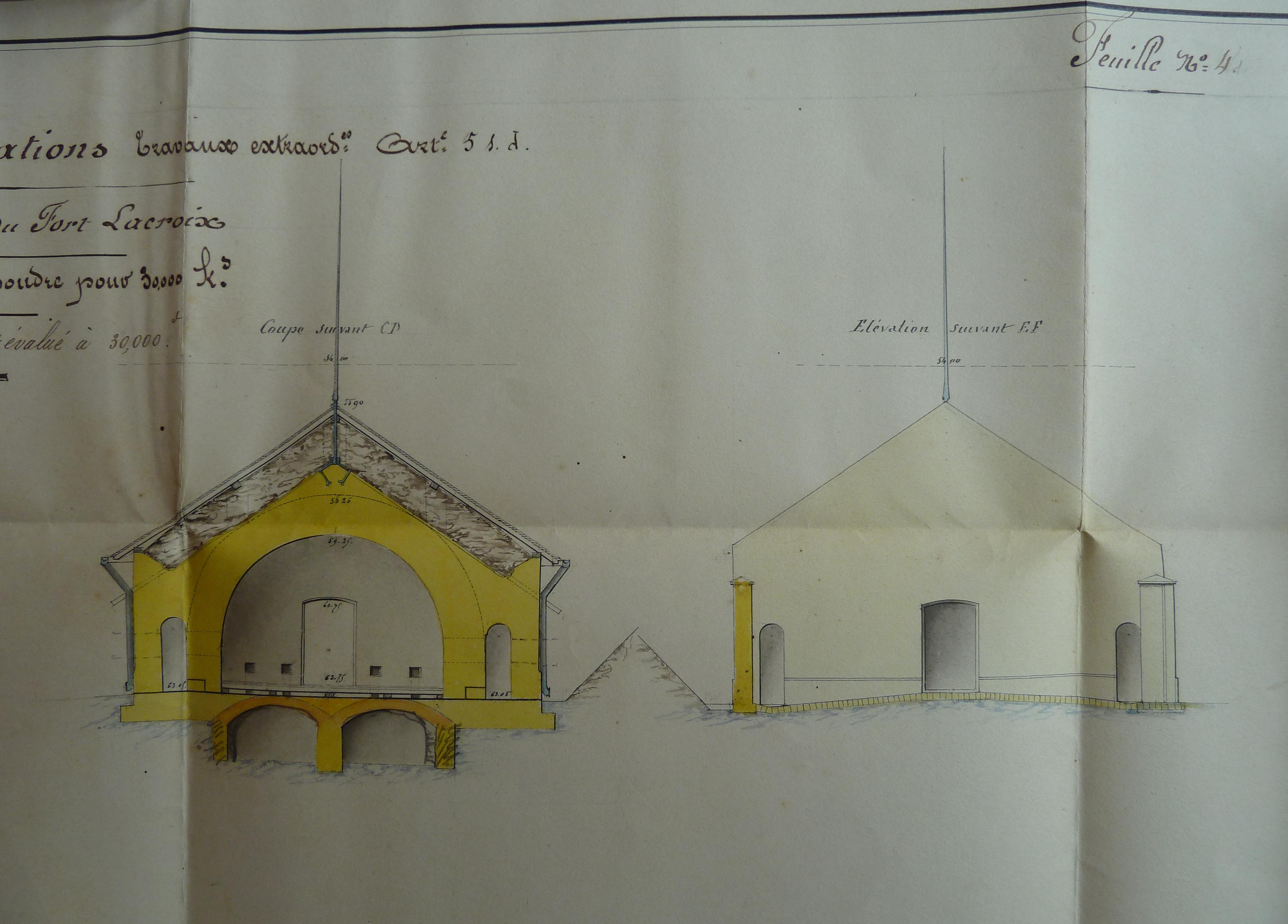 1 VH 1474. Place de Port-Louis, feuille n° 4 des projets pour 1849, achèvement du fort Lacroix, magasin à poudre pour 30000 kg, 17 décembre 1848.Immatriculation