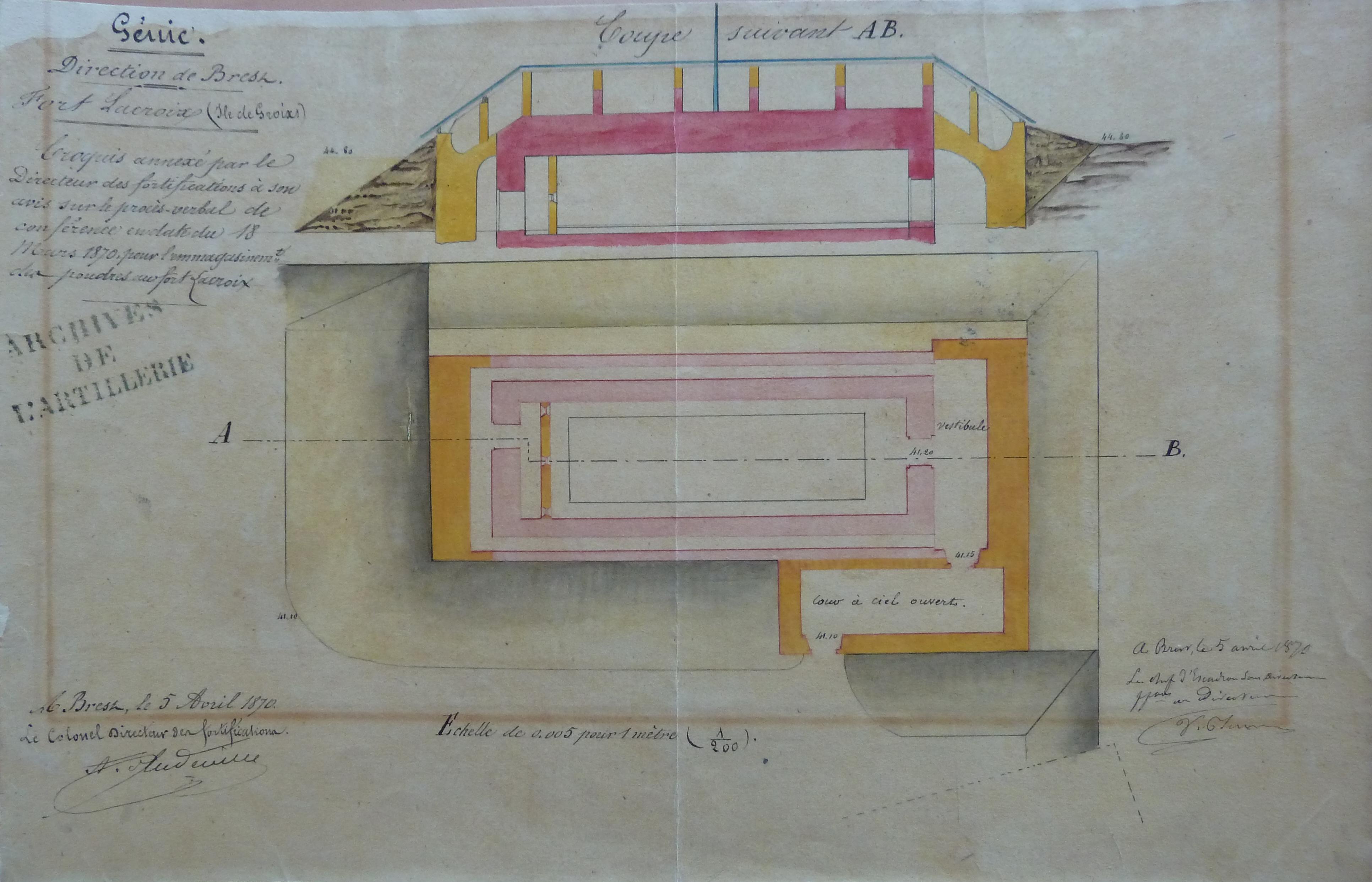 Service historique de la Défense, Département Armée de Terre, Vincennes. Archives de l'Artillerie ; Sous-série 3 W, Opérations militaires : 3 W 58, Documents particuliers à la Direction de Brest. Direction du Génie de Brest, Croquis annexé par le Directeur des fortifications à son avis sur le procès-verbal de conférence en date du 18 mars 1870, pour l'emmagasinement des poudres au fort Lacroix, 5 avril 1870.