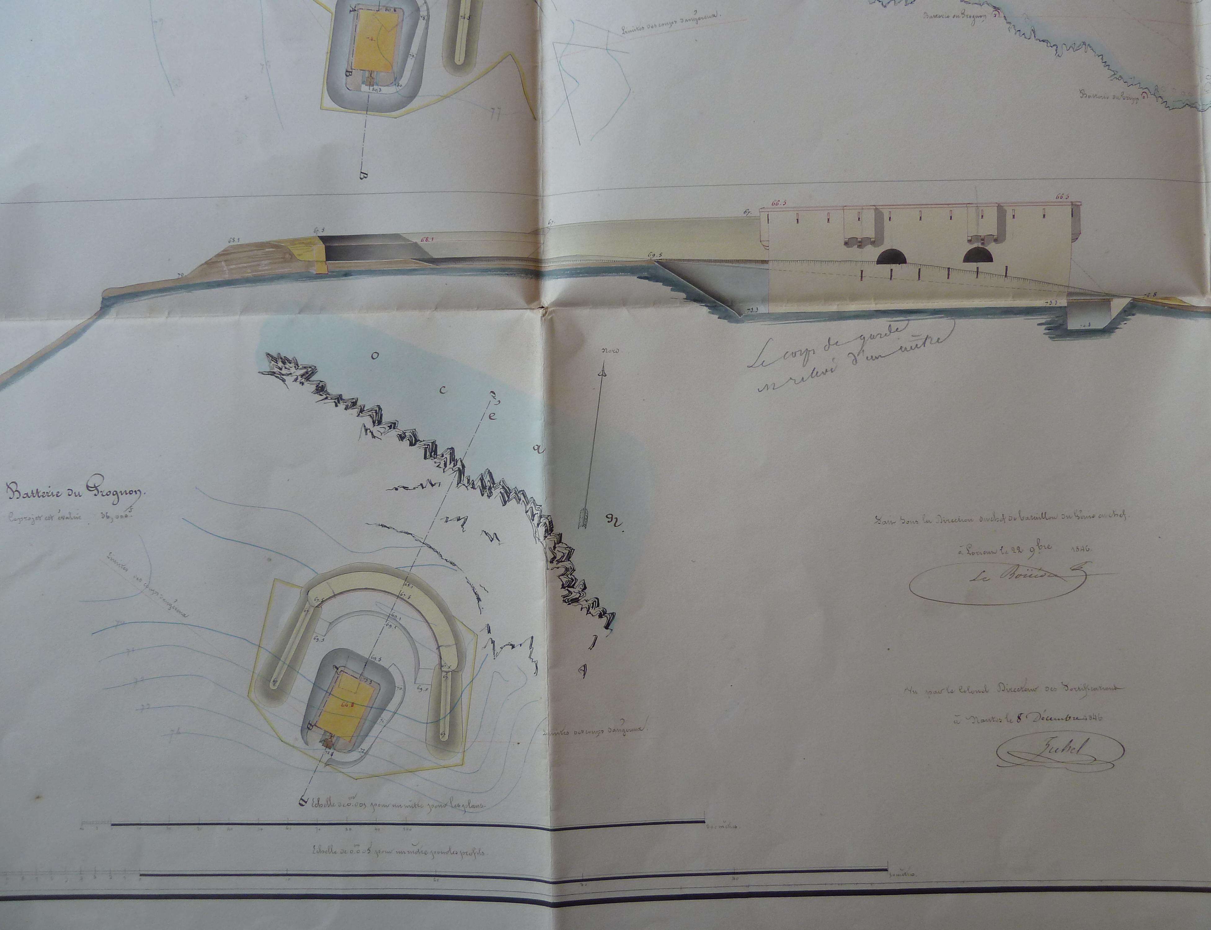 1 VH 1474. Place de Port-Louis, feuille n° 8 des projets pour 1848, travaux extraordinaires pour la défense des côtes, batteries du Gripp et du Grognon, 22 novembre 1846.Immatriculation