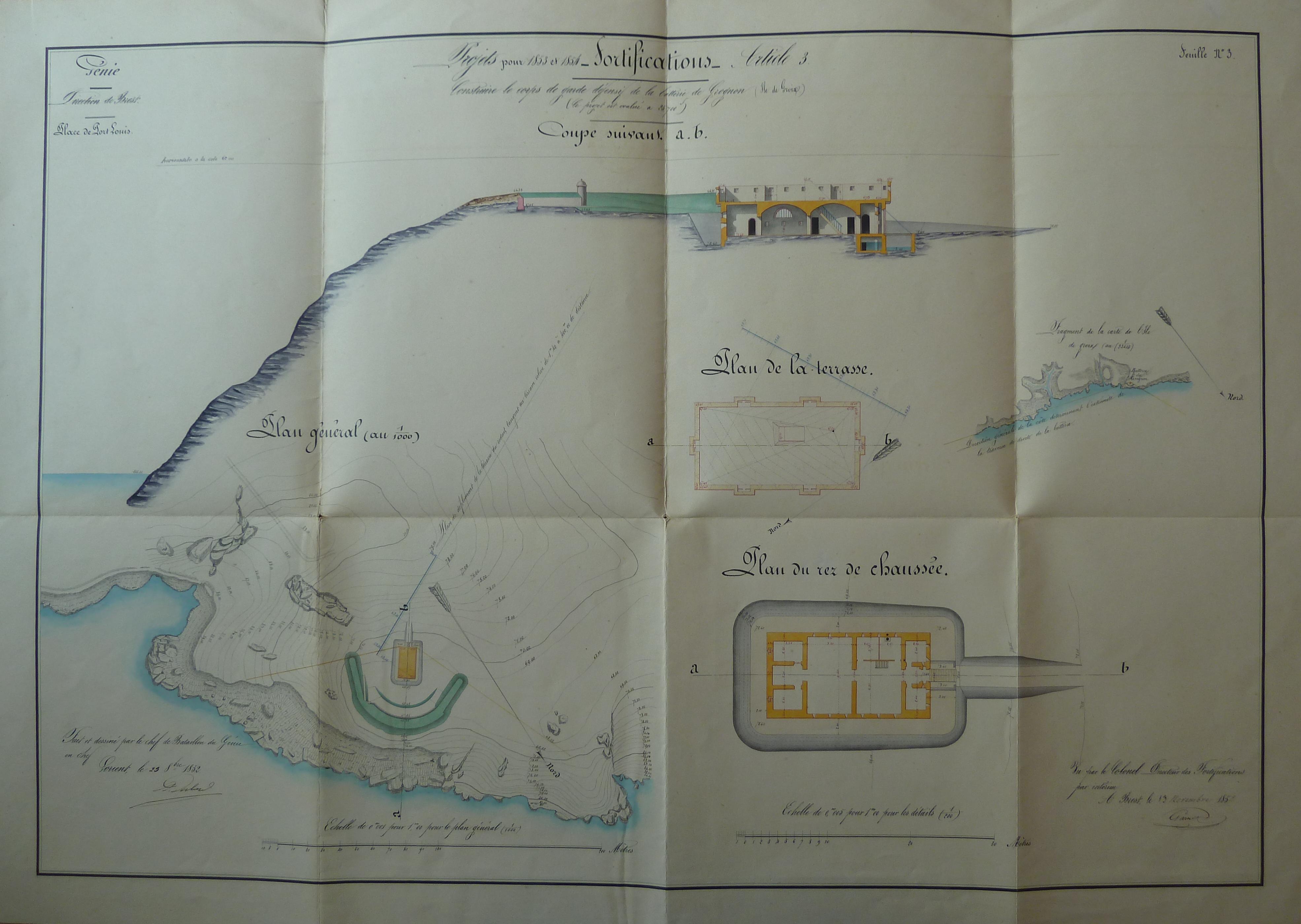 Service historique de la Défense, département Armée de Terre, Vincennes. Archives du Génie ; Article 8, Places françaises et d'Algérie : 1 VH 1474, Place de Port-Louis, projets et dépenses annuels, 1847-1856. Direction du Génie de Nantes, Place de Port-Louis, feuille n° 3 des projets pour 1853-1854, construire le corps de garde défensif de la batterie de Grognon (Ile de Groix), 23 octobre 1852.