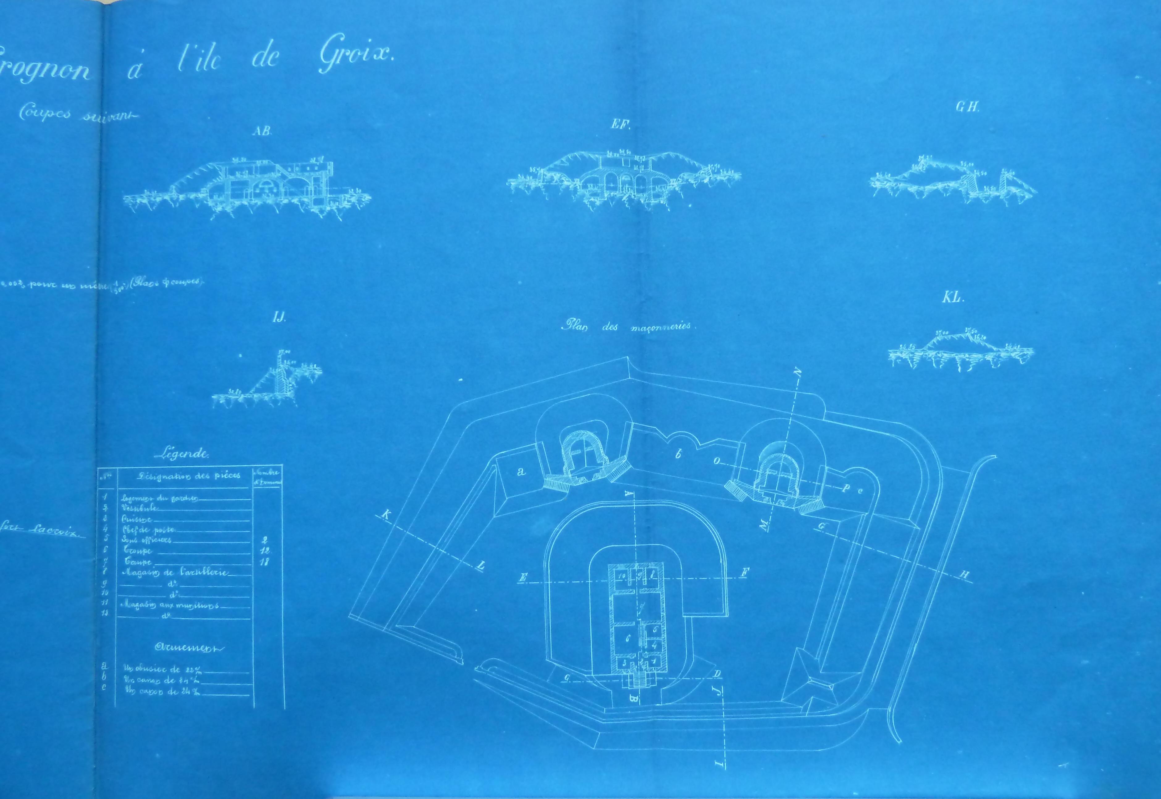 Service historique de la Défense, Département Armée de Terre, Vincennes. Archives de la Guerre, Troisième République ; Sous-série 7 N, Etat-Major de l'Armée : 7 N 1905, Défense des fronts de mer, dossiers de l’inspection générale permanente d’armement des côtes - Atlantique : pièces collectives, Fort Médoc, Fort Paté, La Rochelle, embouchure de laLoire, Lorient, Nantes, Quiberon, Rochefort, Iles d’Aix et d’Oléron, Saint-Nazaire (1878-1898), Iles de Groix, d’Ouessant et de Ré (1887-1907). Croquis joint au procès-verbal de conférence du 20 février 1892, batterie du Bas Grognon, état des lieux.