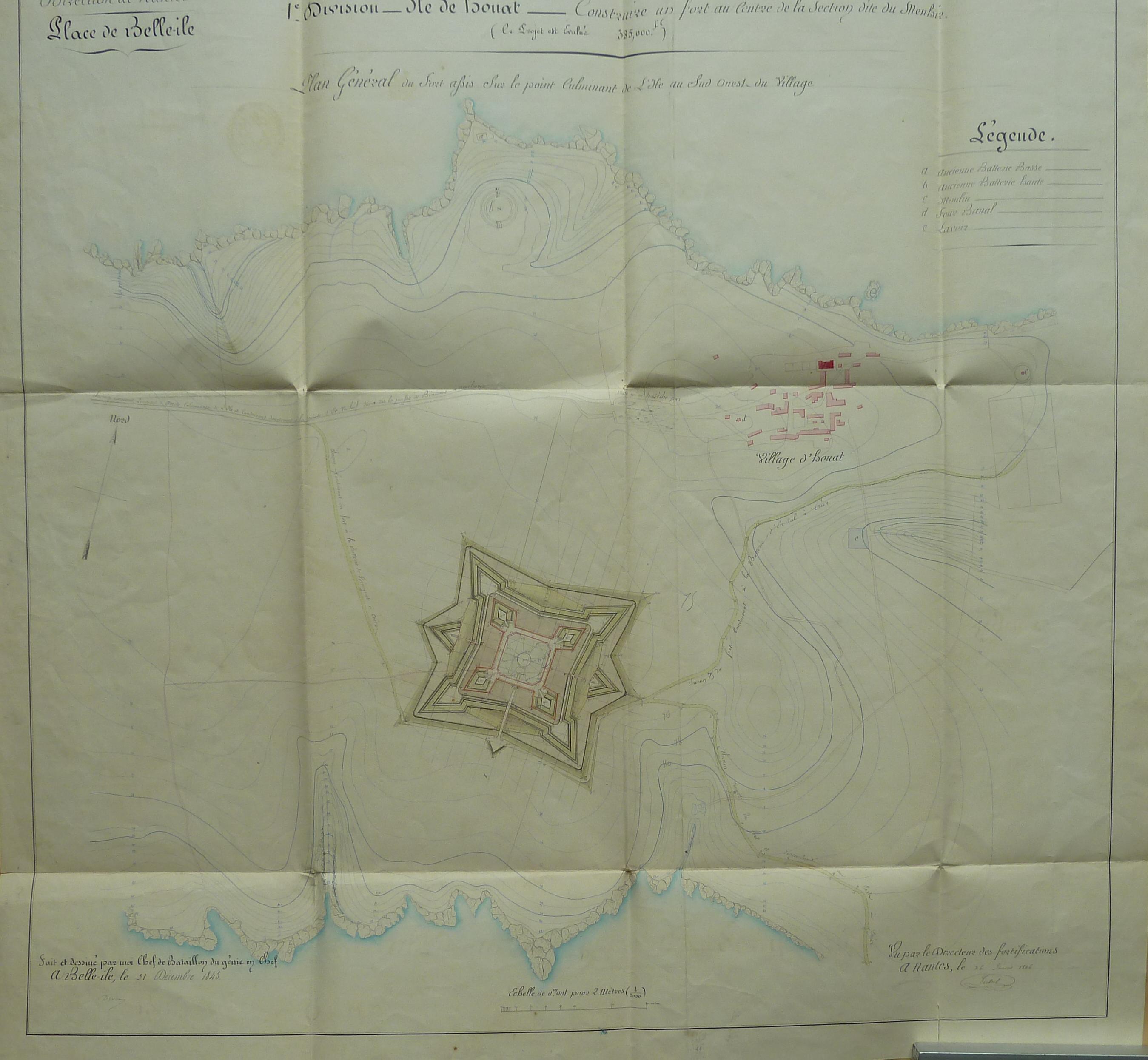Service historique de la Défense, département Armée de Terre, Vincennes. Archives du Génie ; Article 8, Places françaises et d'Algérie : 1 VH 291, Place de Belle-Île-en-Mer, projets et dépenses annuels, 1843-1846. Direction du Génie de Nantes, Place de Belle-Île-en-Mer, feuille des projets extraordinaires pour 1846, Ile de Houat, construire un fort au centre de la section dite du Menhir, 31 décembre 1845.