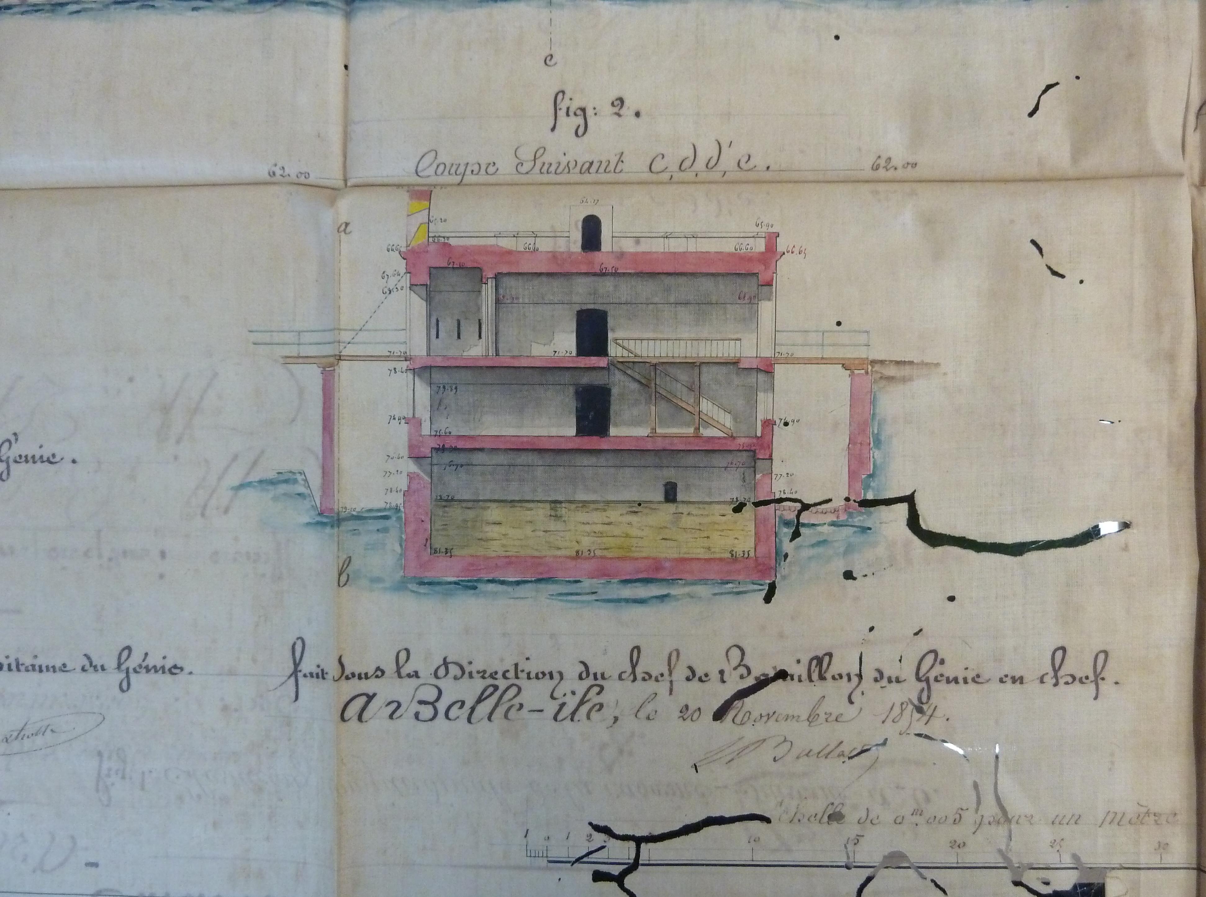 Service historique de la Défense, Département Marine, Lorient. Archives de la Place et du Génie de Belle-Île-en-Mer ; Sous-série 4 S3, archives de la Place de Houat-Hoedic : 4 S3 5, projets, Houat. Direction du Génie de Brest, Place de Houat-Hoedic, feuille n° 3 des projets pour 1855-1856, achever le fort de Houat, 20 novembre 1854.