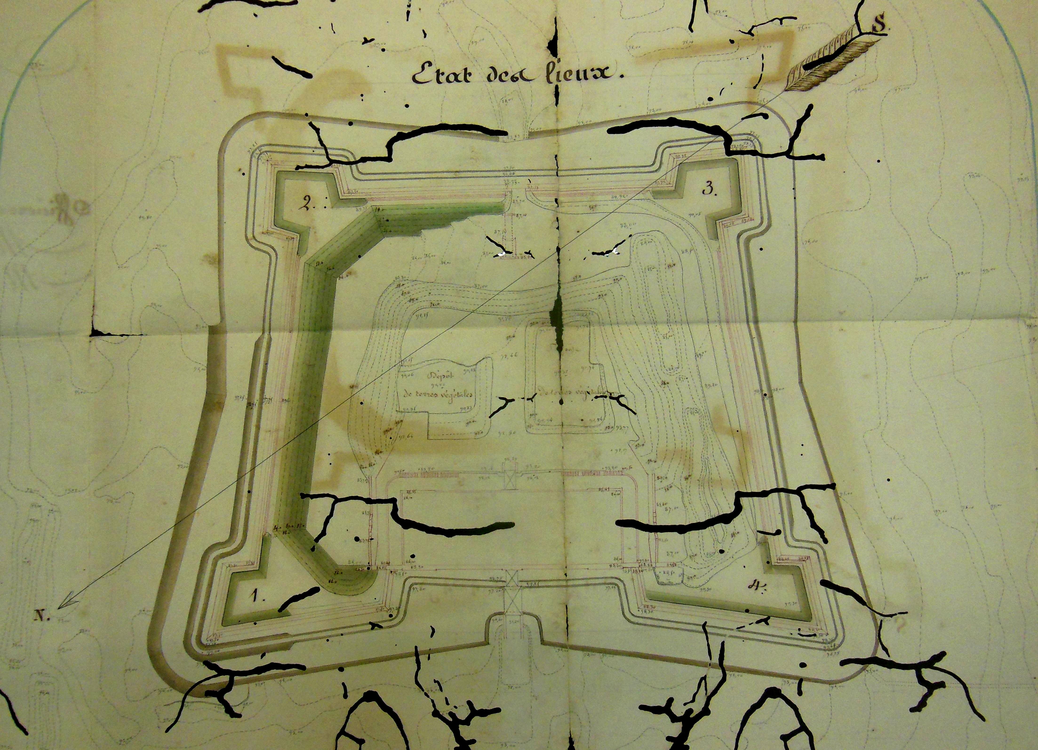 Service historique de la Défense, Département Marine, Lorient. Archives de la Place et du Génie de Belle-Île-en-Mer ; Sous-série 4 S3, archives de la Place de Houat-Hoedic : 4 S3 5, projets, Houat. Direction du Génie de Brest, Place de Houat-Hoedic, feuille n° 4 des projets pour 1855-1856, achever le fort d'Hoedic, état des lieux, 20 novembre 1854.