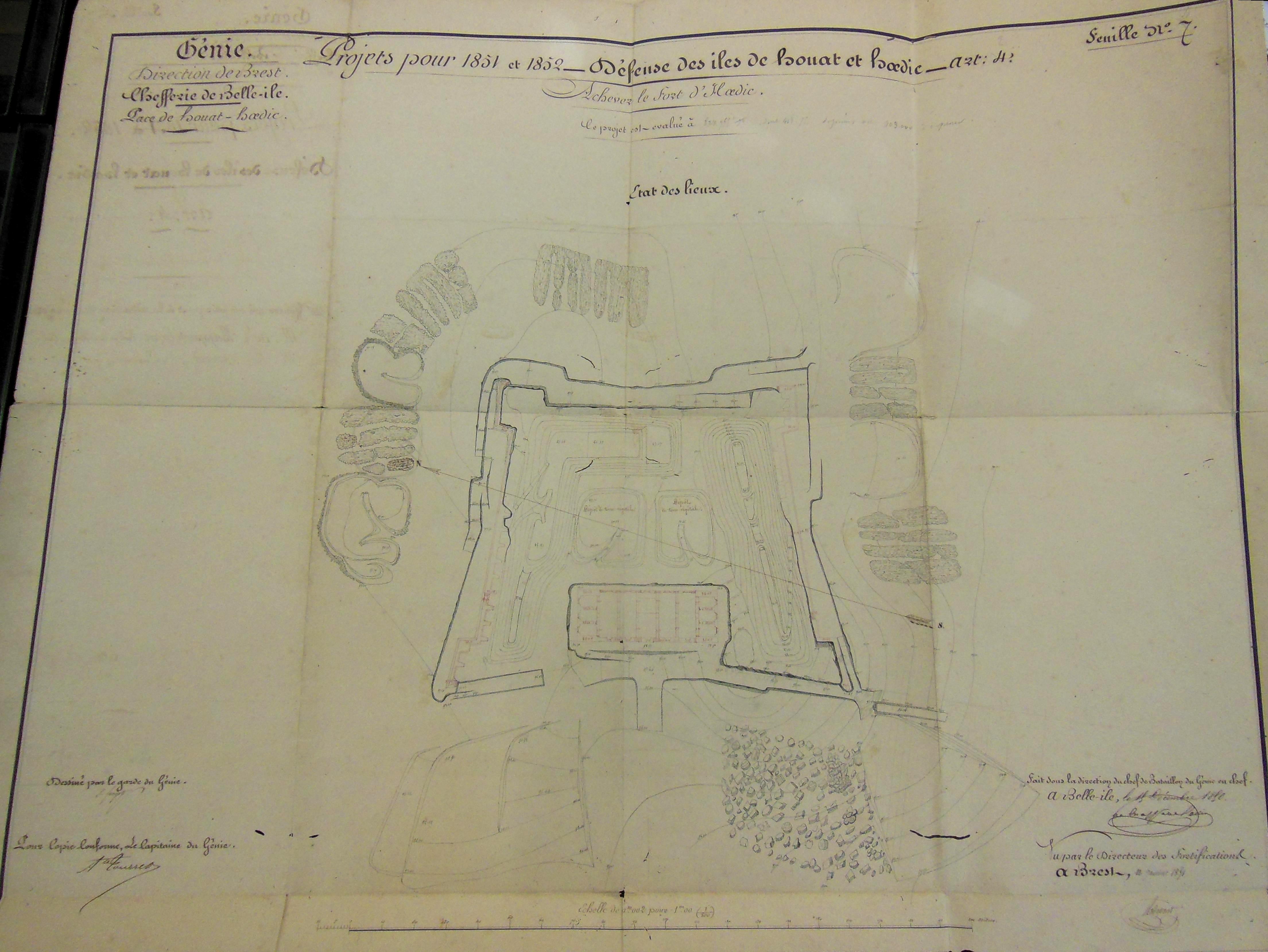 Service historique de la Défense, Département Marine, Lorient. Archives de la Place et du Génie de Belle-Île-en-Mer ; Sous-série 4 S3, archives de la Place de Houat-Hoedic : 4 S3 5, projets, Houat. Direction du Génie de Brest, Place de Houat-Hoedic, feuille n° 7 des projets pour 1851-1852, achever le fort d'Hoedic, état des lieux, 15 décembre 1850.