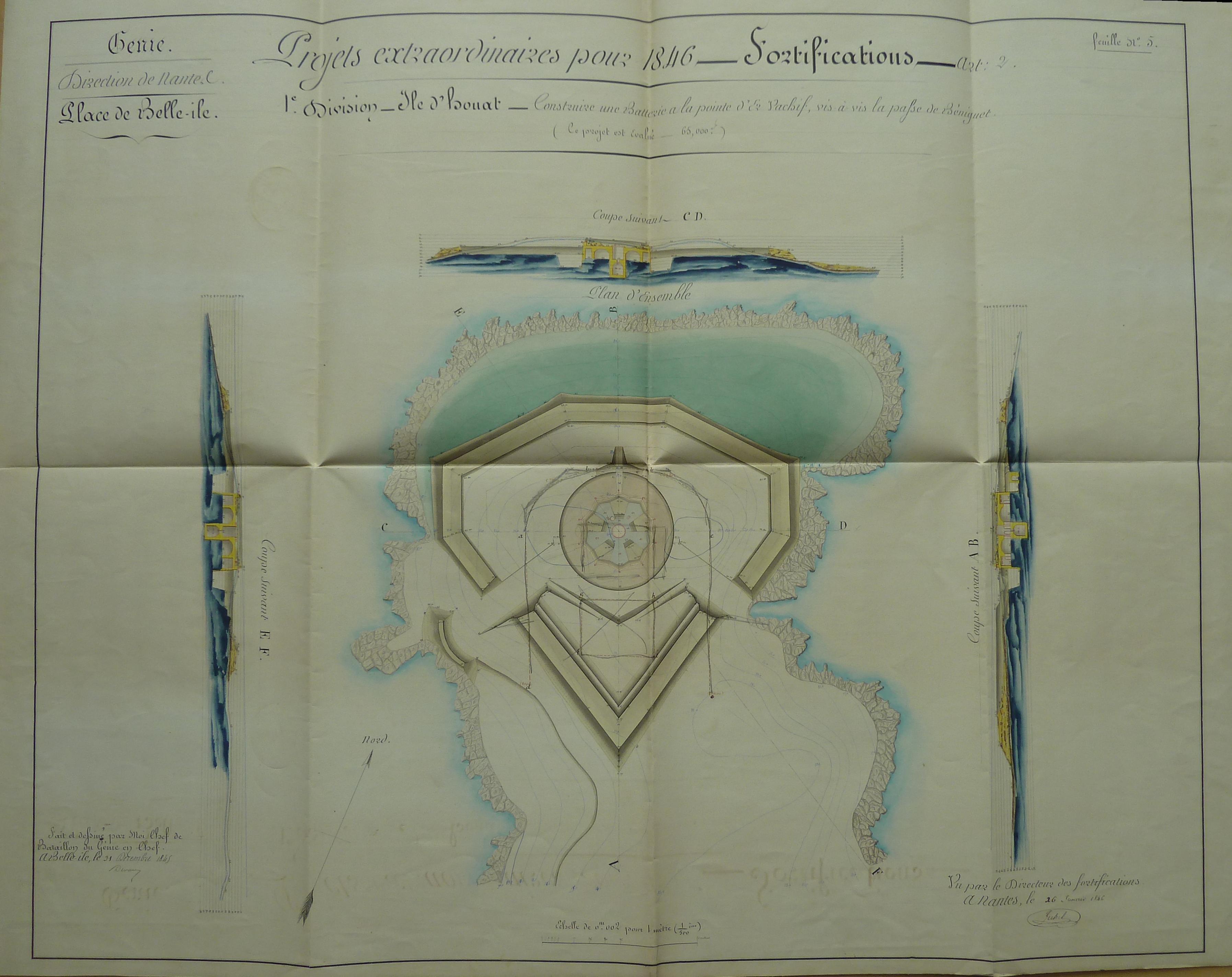 Service historique de la Défense, département Armée de Terre, Vincennes. Archives du Génie ; Article 8, Places françaises et d'Algérie : 1 VH 291, Place de Belle-Île-en-Mer, projets et dépenses annuels, 1843-1846. Direction du Génie de Nantes, Place de Belle-Ile, feuille n° 5 des projets extraordinaires pour 1846, Ile d'Houat, construire une batterie à la pointe d'Er Vachif, vis-à-vis de la passe de Béniguet, 31 décembre 1845.