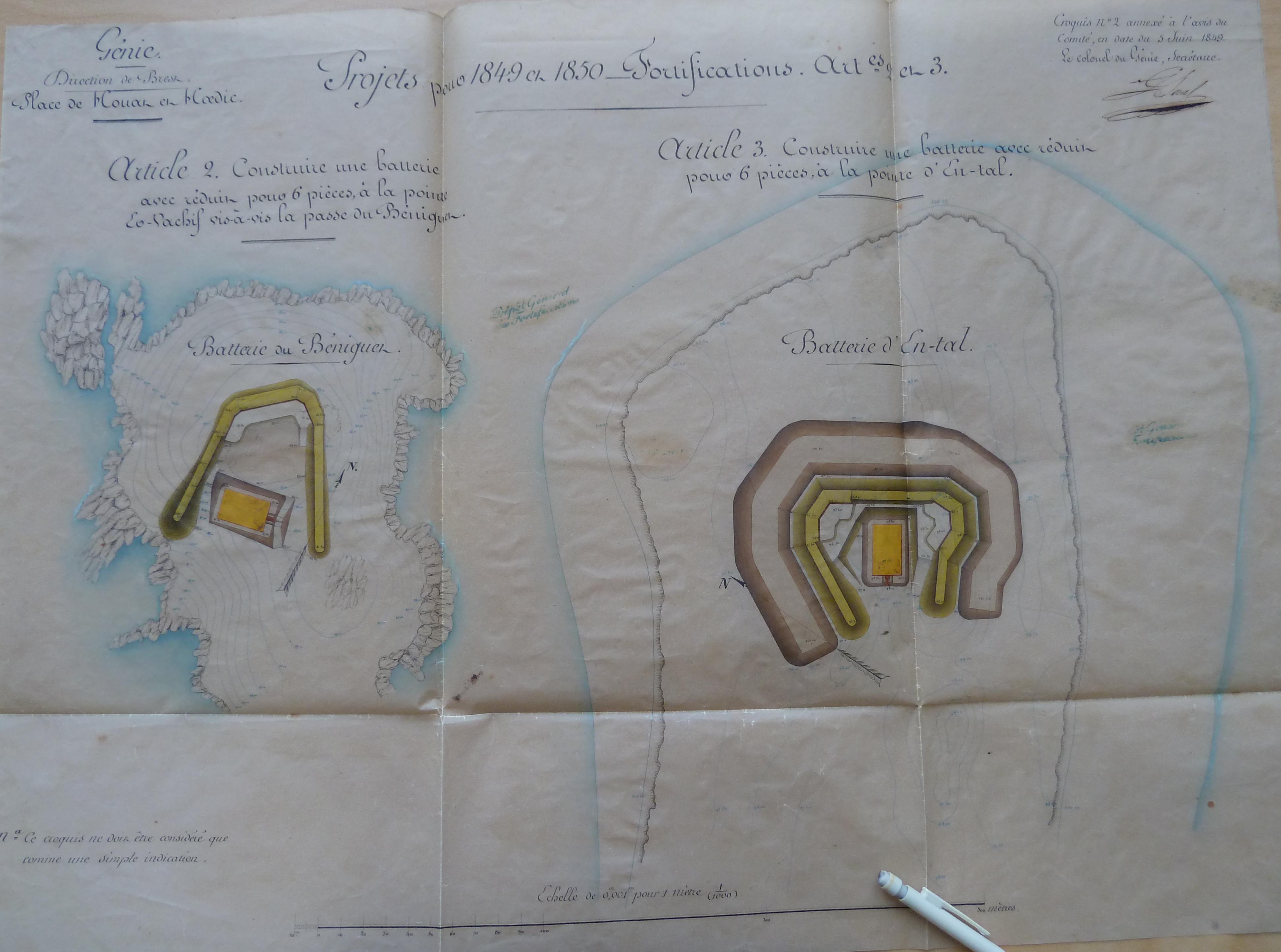 Service historique de la Défense, département Armée de Terre, Vincennes. Archives du Génie ; Article 12, Avis du Comité : 1 VK 534, Croquis annexés aux avis du Comité, Bellegarde, Belle-Île-en-Mer, Bergues (1818-1885). Croquis n° 2 annexé à l'avis du Comité en date du 5 juin 1849, batteries d'Er Vachif et d'En Tal.