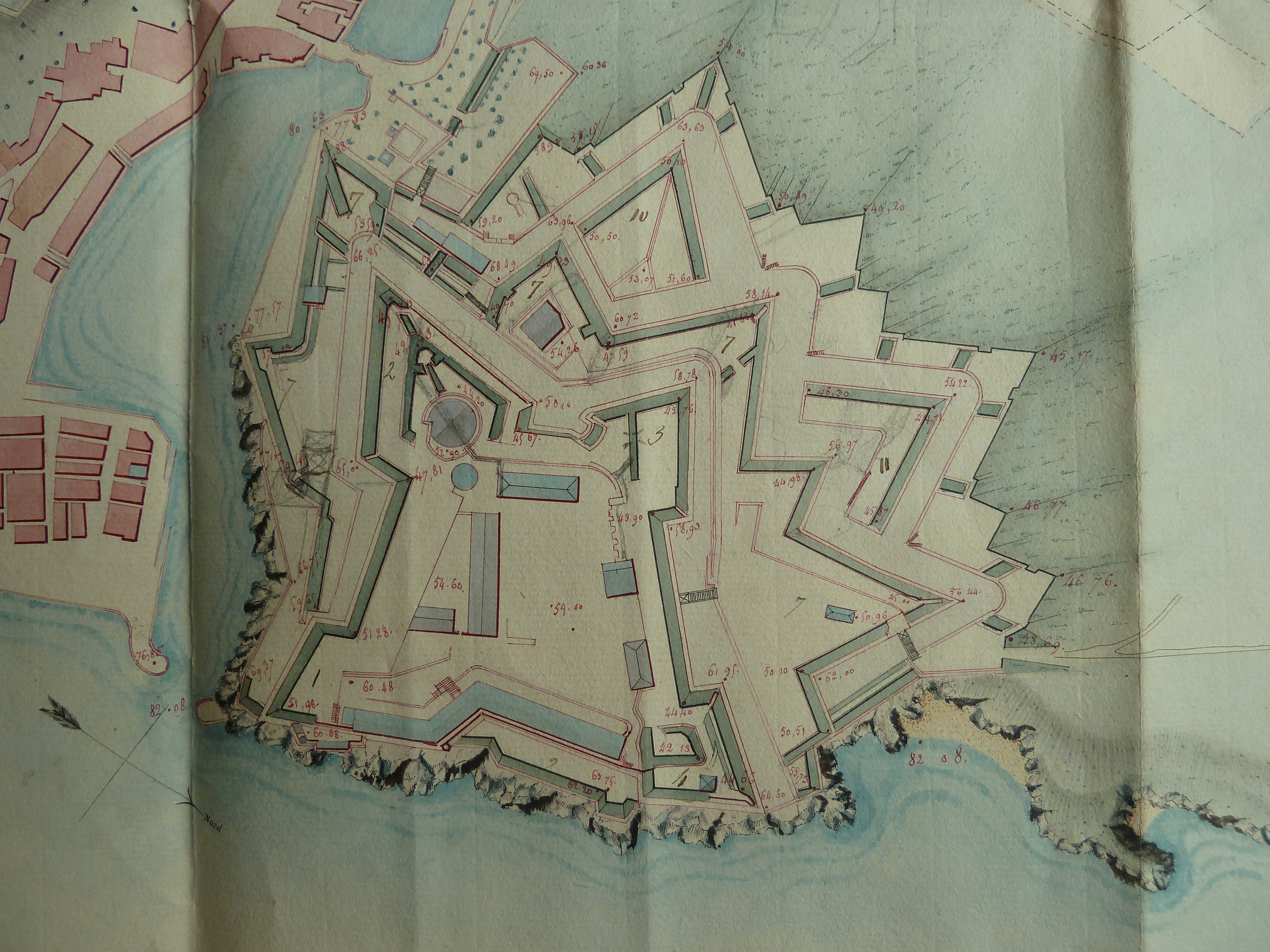 Service historique de la Défense, département Armée de Terre, Vincennes. Archives du Génie ; Article 8, Places françaises et d'Algérie : 1 VH 287, Place de Belle-Île-en-Mer, projets et dépenses annuels, 1817-1825. Direction du Génie de Port-Louis, Place de Belle-Isle-en-Mer, feuille n° 1 des projets pour 1823, plan de la citadelle et de ses environs pour servir à l'intelligence du projet général de rectification des différens ouvrages de fortification, 15 novembre 1822.