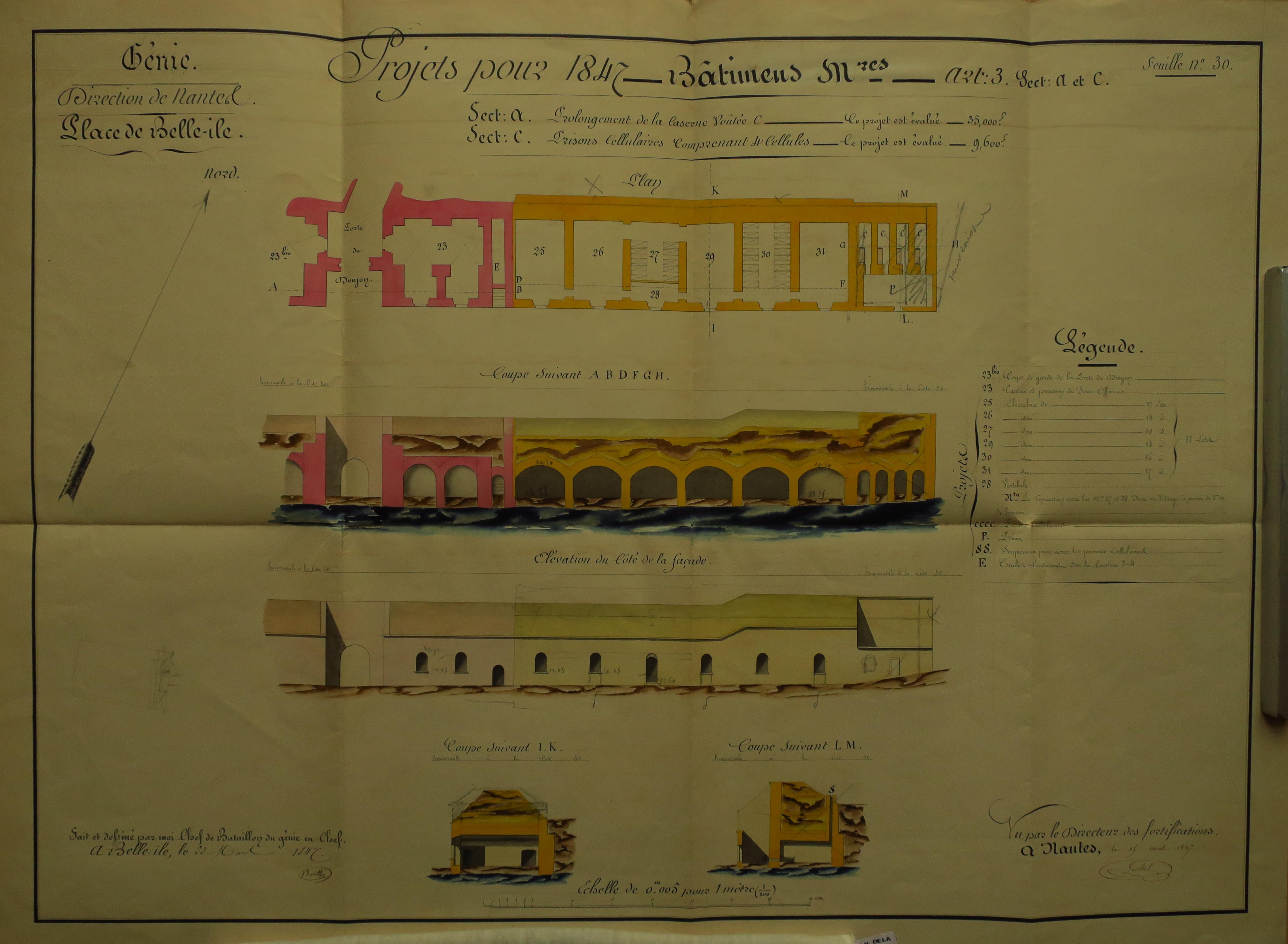 Service historique de la Défense, département Armée de Terre, Vincennes. Archives du Génie ; Article 8, Places françaises et d'Algérie : 1 VH 292, Place de Belle-Île-en-Mer, projets et dépenses annuels, 1847. Direction du Génie de Nantes, Place de Belle-Ile, feuille n° 30 des projets pour 1847, prolongement de la caserne voûtée C, 23 mars 1847.