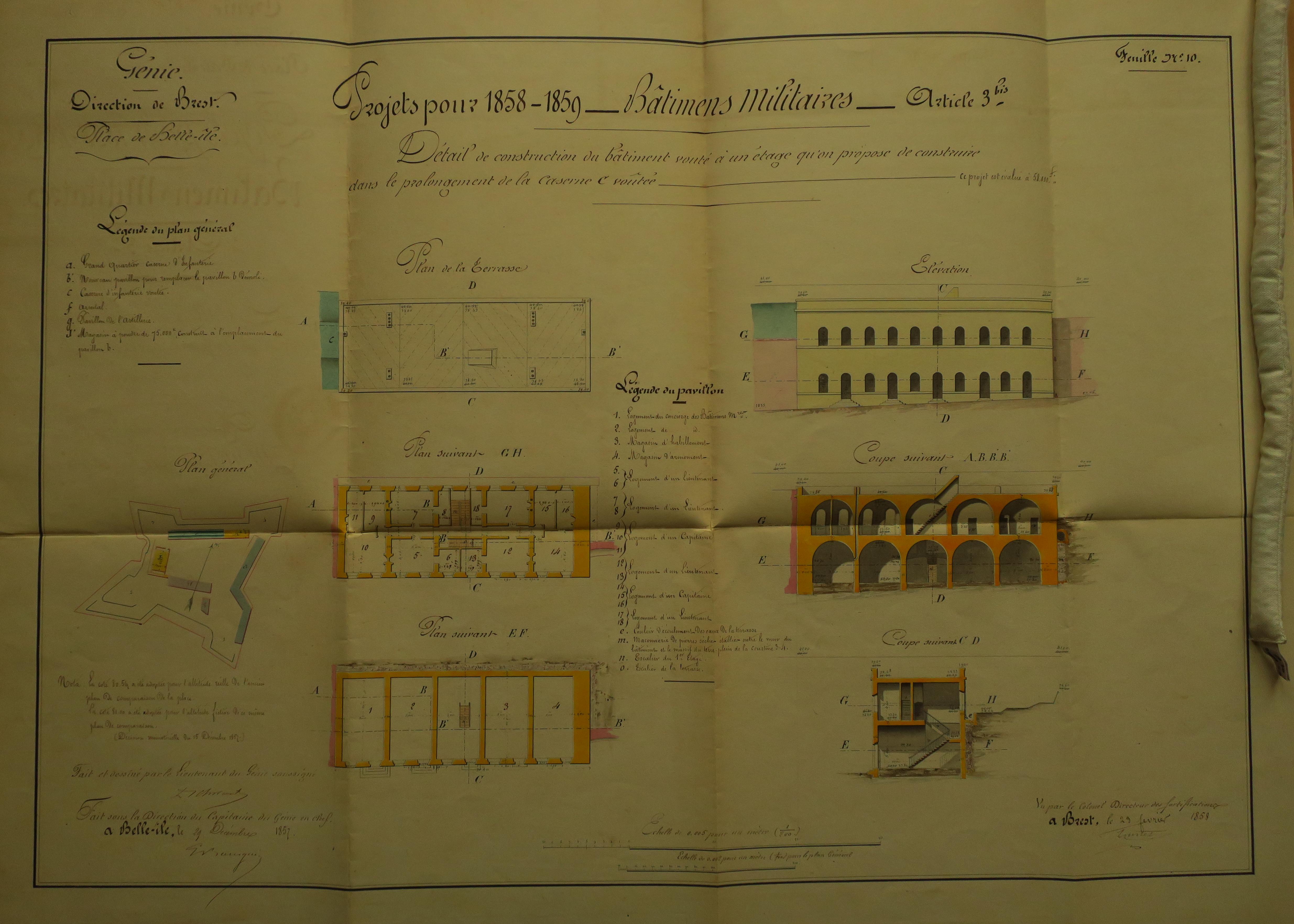 Service historique de la Défense, département Armée de Terre, Vincennes. Archives du Génie ; Article 8, Places françaises et d'Algérie : 1 VH 295, Place de Belle-Île-en-Mer, projets et dépenses annuels, 1858-1859. Direction du Génie de Brest, Place de Belle-Ile, feuille n° 10 des projets pour 1858-1859, détail de construction du bâtiment voûté à un étage qu'on propose de construire dans le prolongement de la caserne C voûtée, 29 décembre 1857.