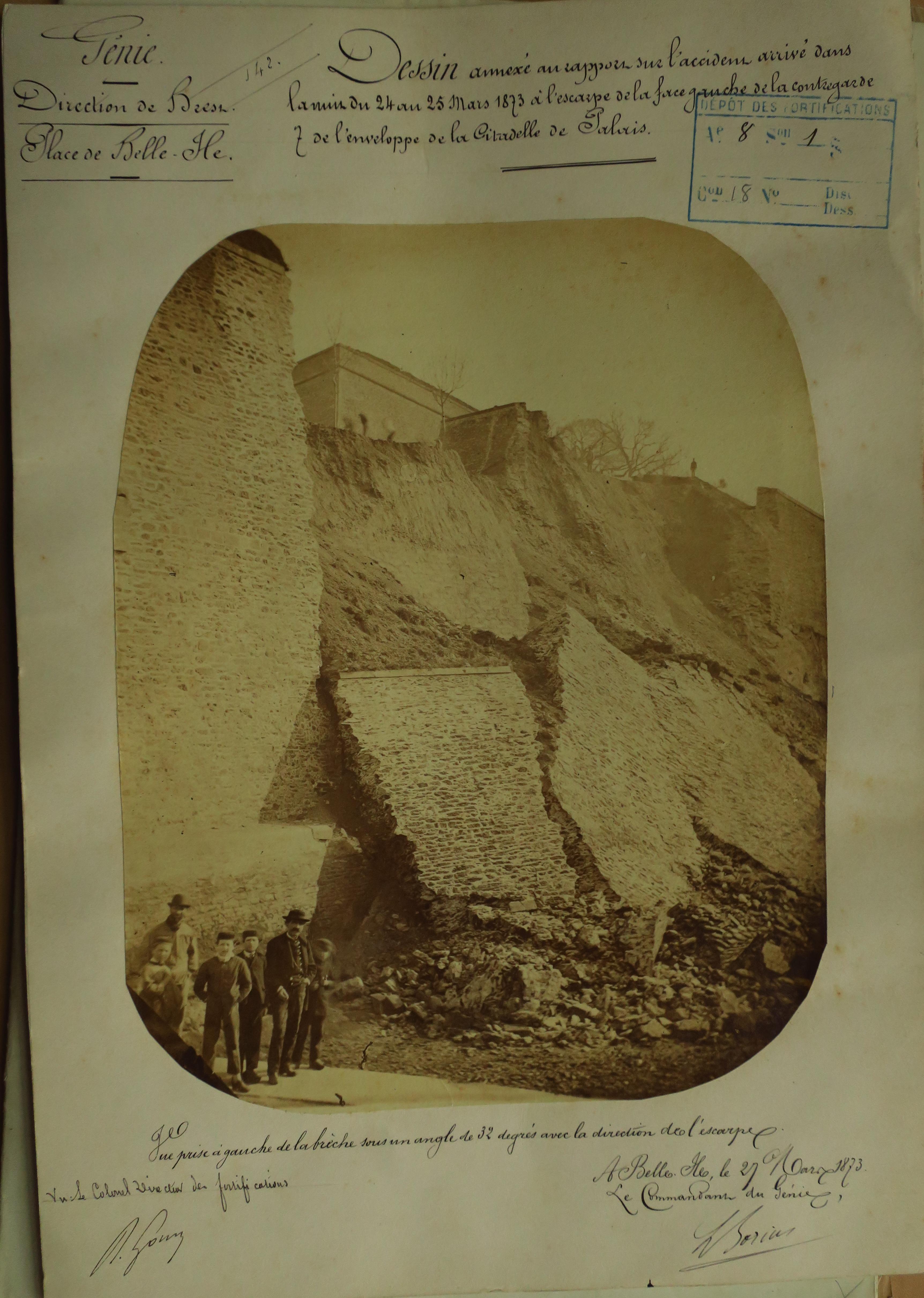 Service historique de la Défense, département Armée de Terre, Vincennes. Archives du Génie ; Article 8, Places françaises et d'Algérie : 1 VH 297, Place de Belle-Île-en-Mer, projets et dépenses annuels, 1862-1875. Direction du Génie de Brest, Place de Belle-Ile-en-Mer, dessin annexé au rapport sur l'accident arrivé dans la nuit du 24 au 25 mars 1873 à l'escarpe de la face gauche de la contregarde 7 de l'enveloppe de la citadelle de Palais, 27 mars 1873.