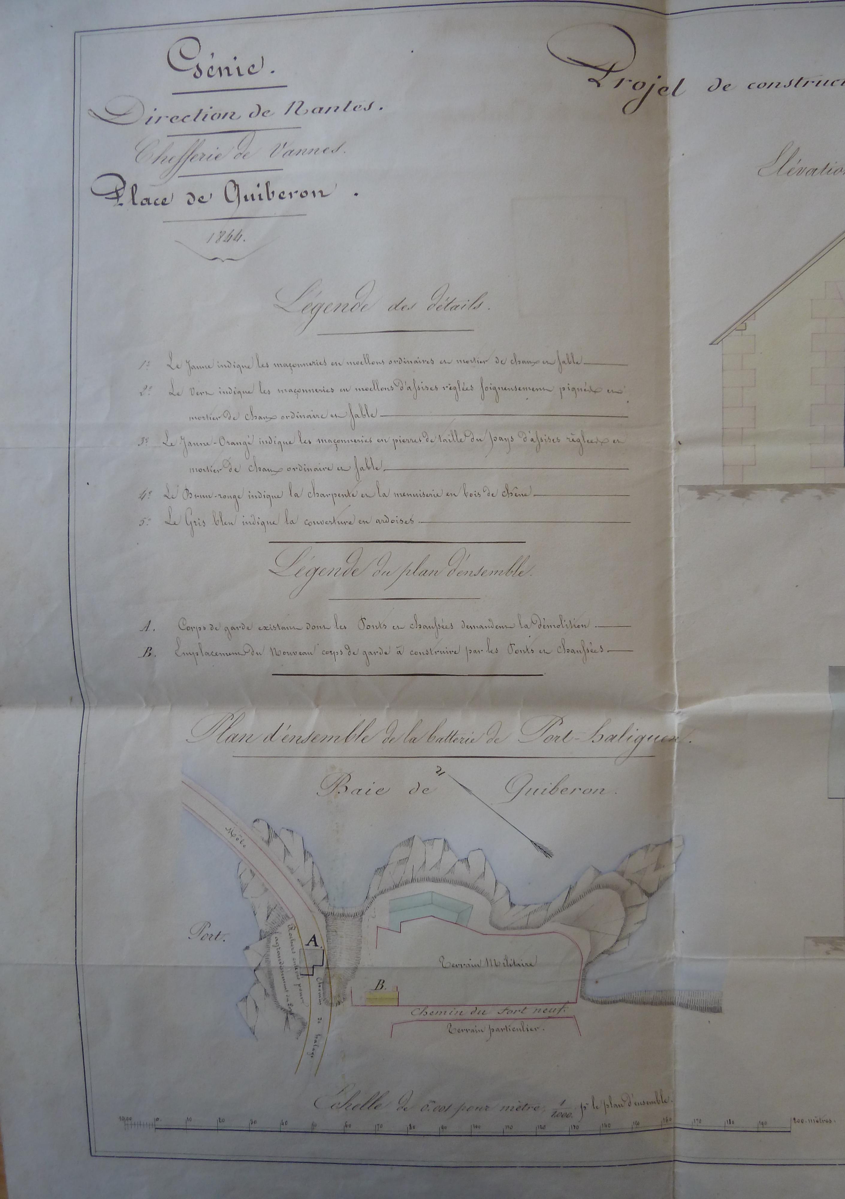 Archives départementales du Morbihan. Série S, Travaux publics et transports ; sous-série 4 S, mer, ports, transport maritime : 4 S 1290, Port Haliguen, 1770-1939. Direction du Génie de Nantes, Place de Quiberon, Projet de construction d'un nouveau corps de garde près de la batterie de Port Haliguen, 30 janvier 1844.