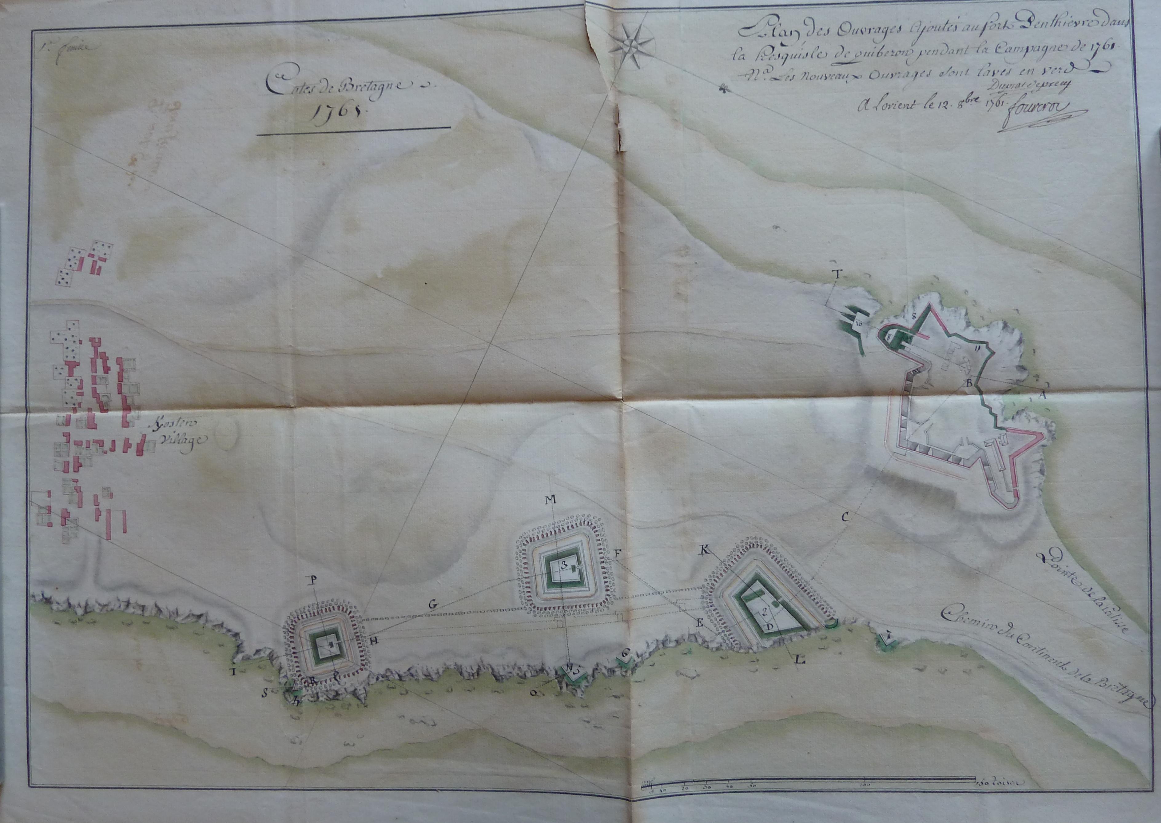 Service historique de la Défense, département Armée de Terre, Vincennes. Archives du Génie ; Article 8, Places françaises et d'Algérie : 1 VH 1515, Place de Quiberon, projets et dépenses annuels, 1747-1822. Plan des ouvrages ajoutés au fort Penthièvre dans la presquisle de Quiberon pendant la campagne de 1761, 12 octobre 1761.