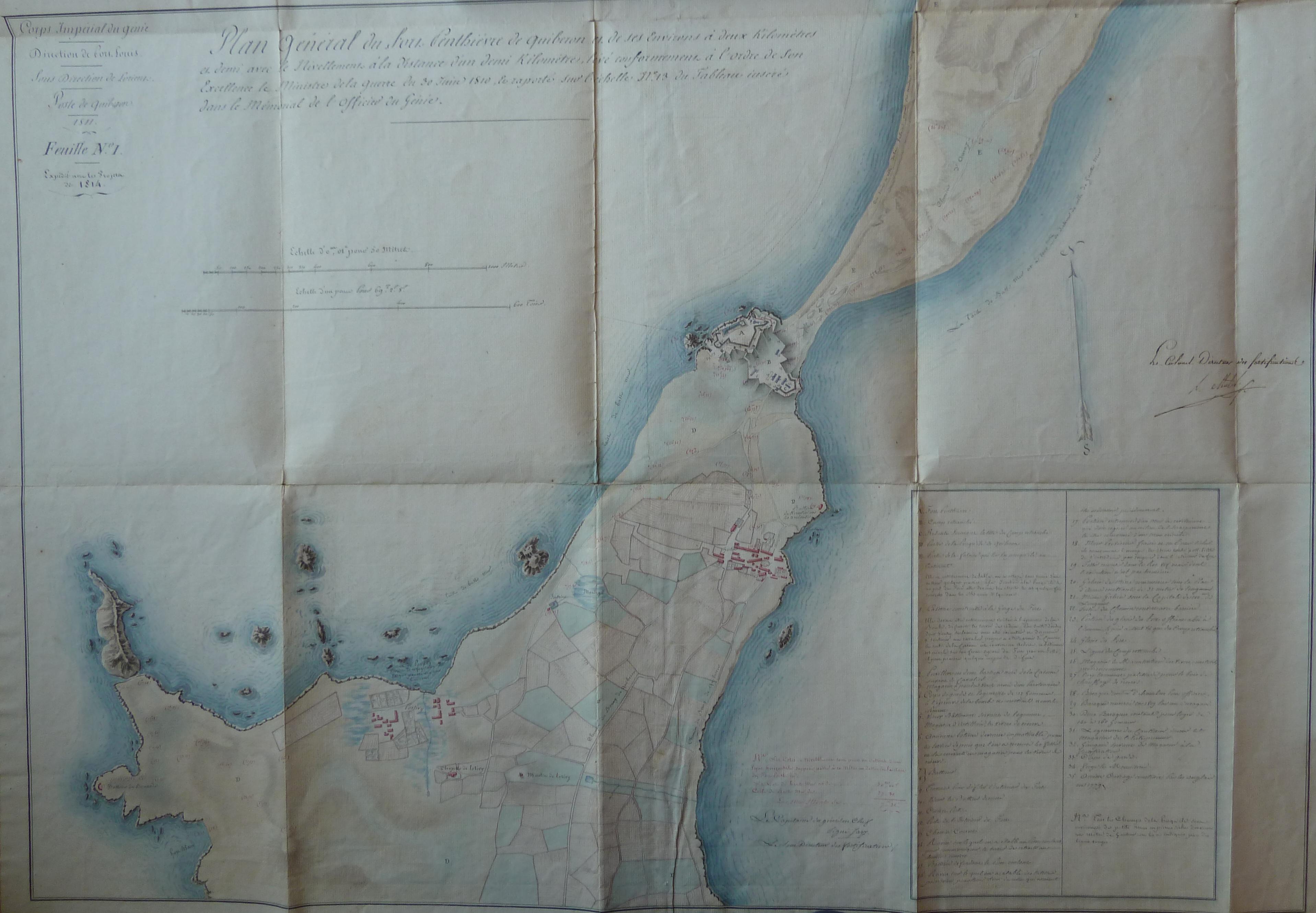 Service historique de la Défense, département Armée de Terre, Vincennes. Archives du Génie ; Article 8, Places françaises et d'Algérie : 1 VH 1515, Place de Quiberon, projets et dépenses annuels, 1747-1822. Direction du Génie de Port-Louis, Poste de Quiberon, feuille n° 1 des projets pour 1811, plan général du fort Penthièvre de Quiberon et de ses environs, 1810.