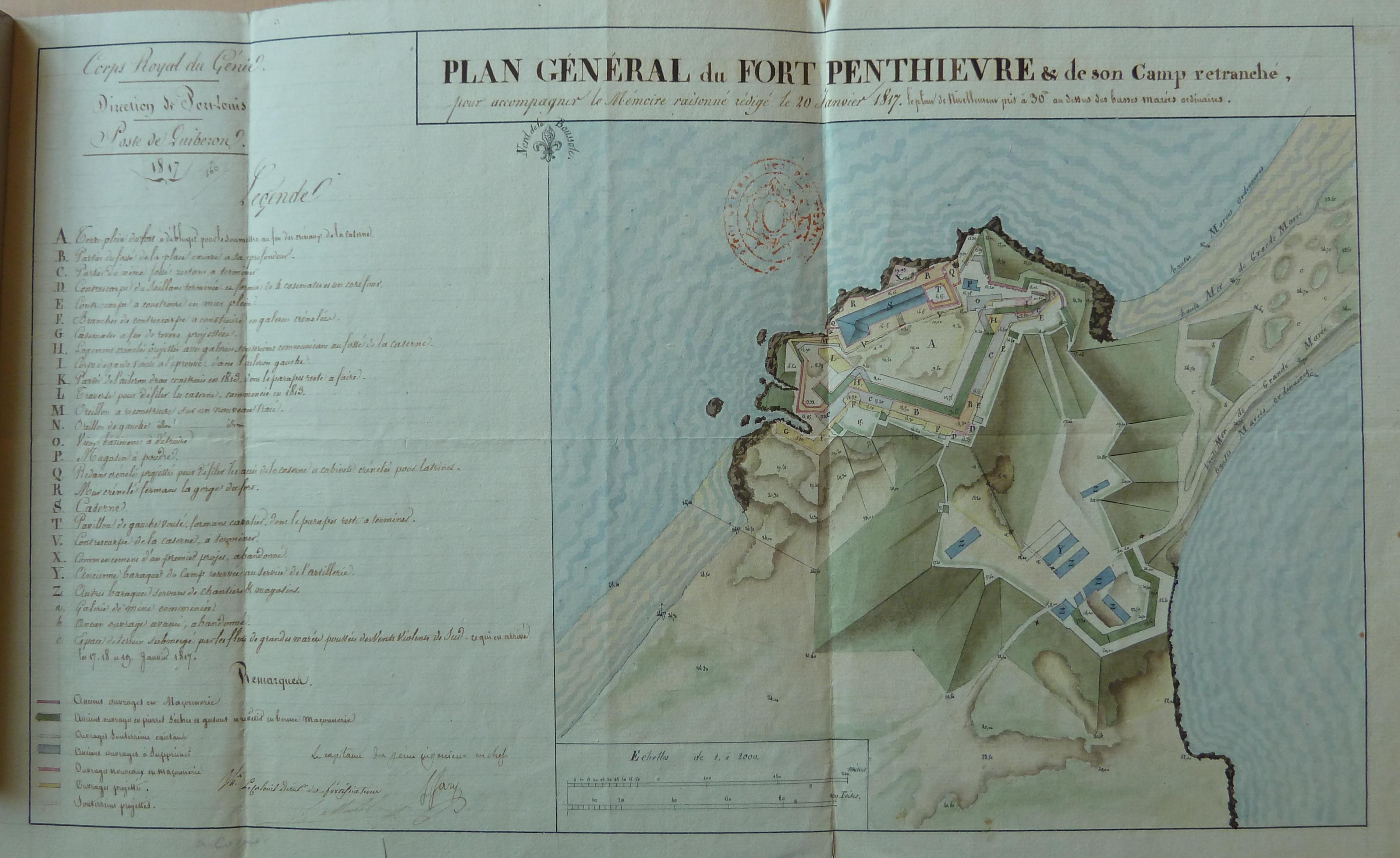 Service historique de la Défense, département Armée de Terre, Vincennes. Archives du Génie ; Article 8, Places françaises et d'Algérie : 1 VH 1515, Place de Quiberon, projets et dépenses annuels, 1747-1822. Direction du Génie de Port-Louis, Poste de Quiberon, plan général du fort Penthièvre et de son camp retranché, 1817.