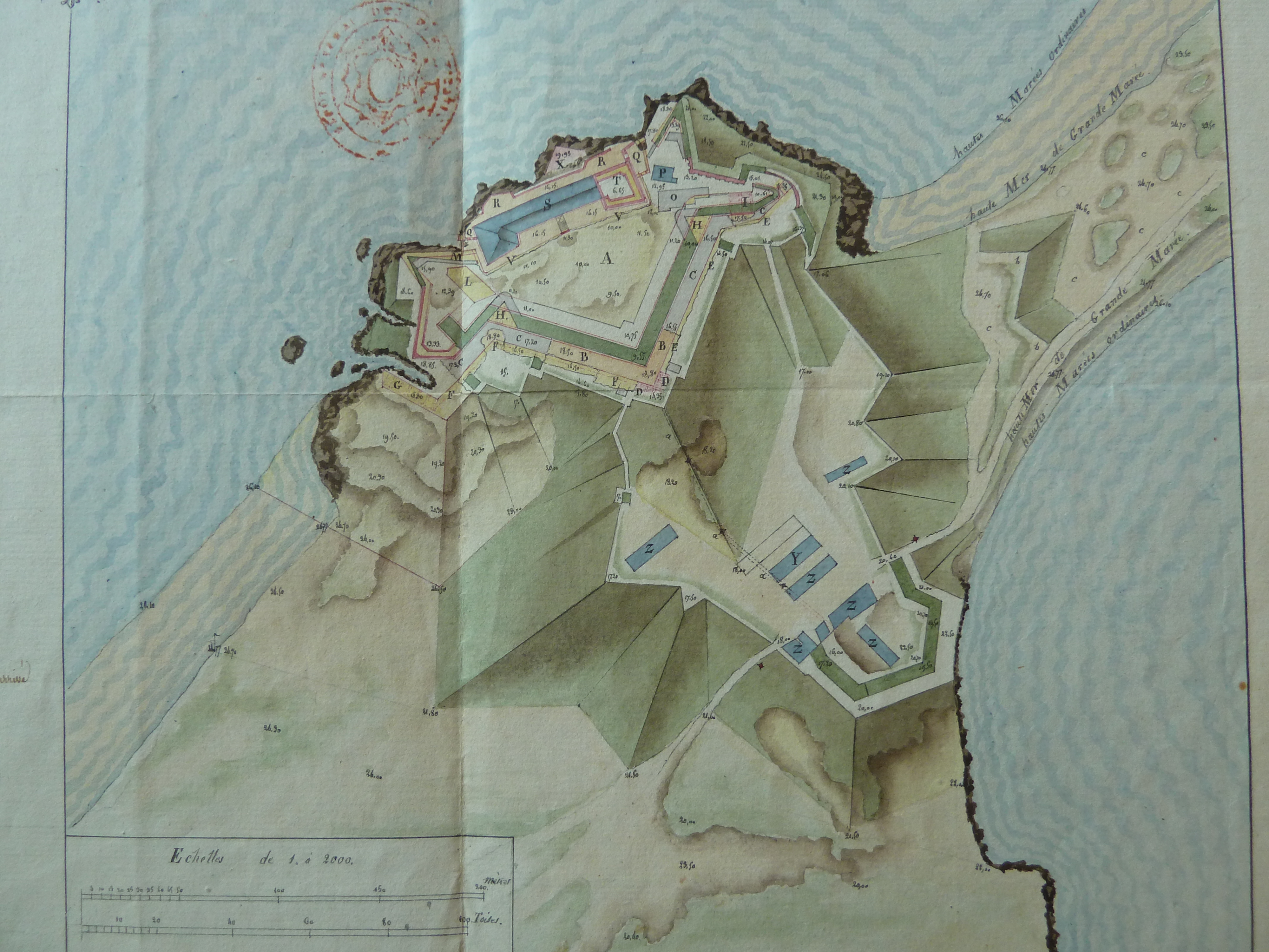 Service historique de la Défense, département Armée de Terre, Vincennes. Archives du Génie ; Article 8, Places françaises et d'Algérie : 1 VH 1515, Place de Quiberon, projets et dépenses annuels, 1747-1822. Direction du Génie de Port-Louis, Poste de Quiberon, plan général du fort Penthièvre et de son camp retranché, 1817.