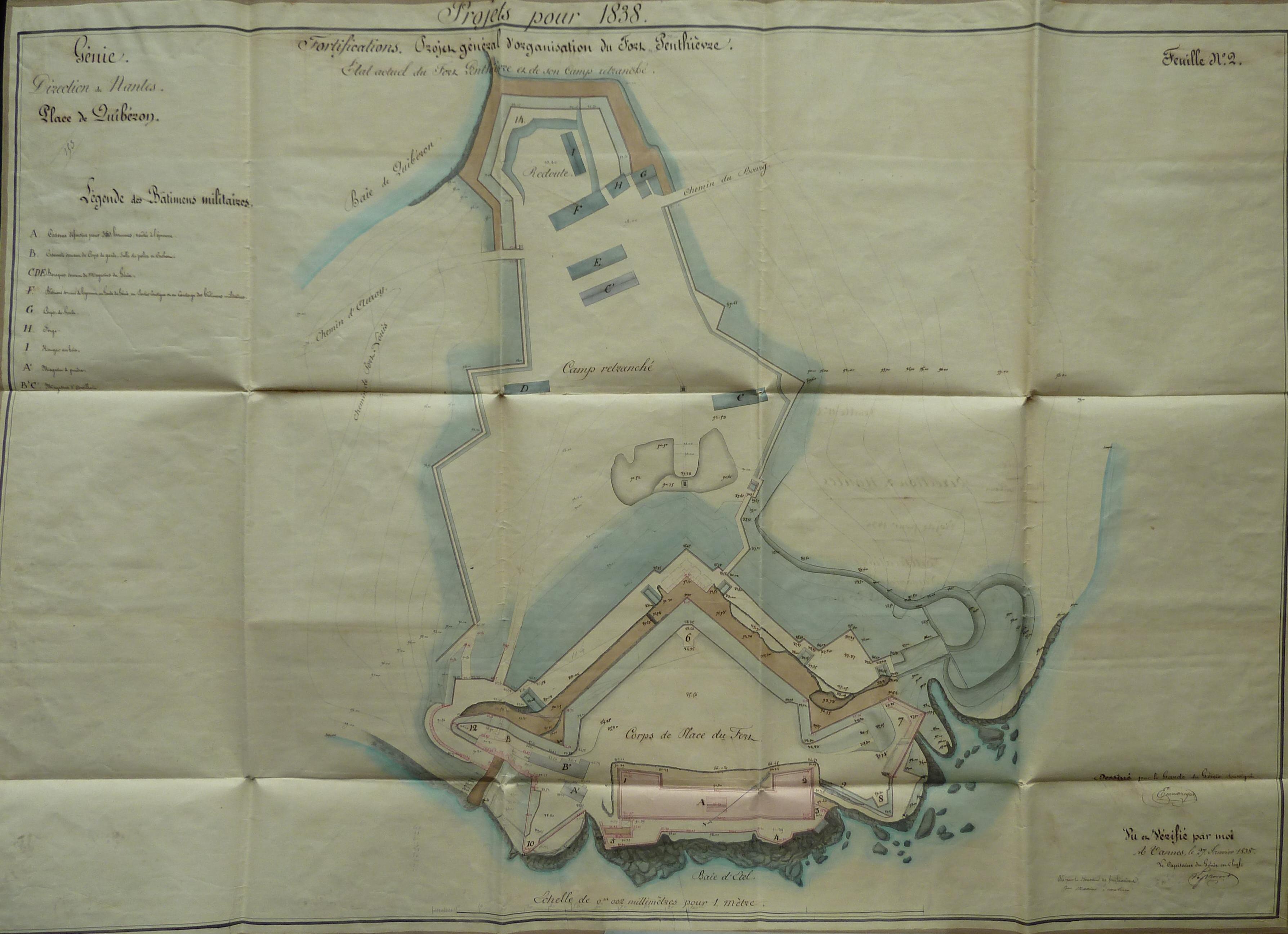 1 VH 2069. Direction du Génie de Nantes, Place de Quiberon, feuille n° 2 des projets pour 1838, projet général d'organisation du fort Penthièvre, état actuel, 27 janvier 1838.Immatriculation
